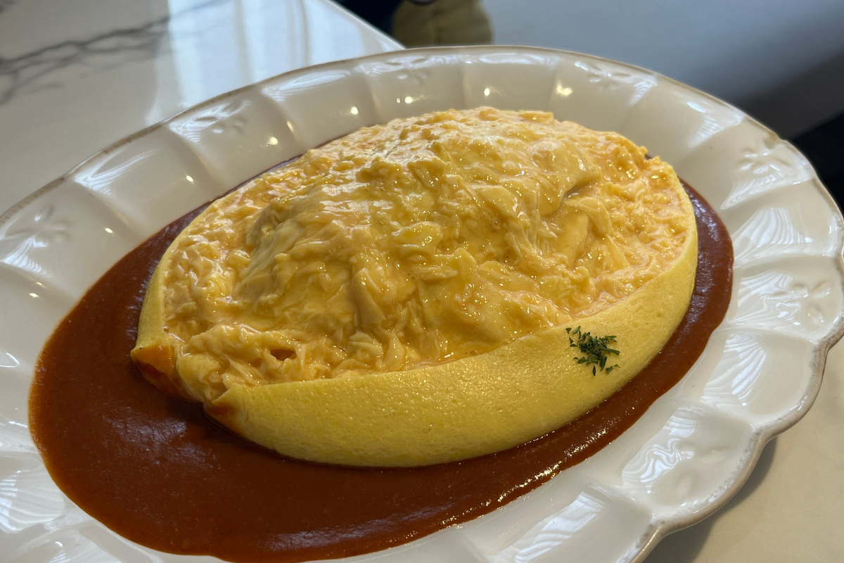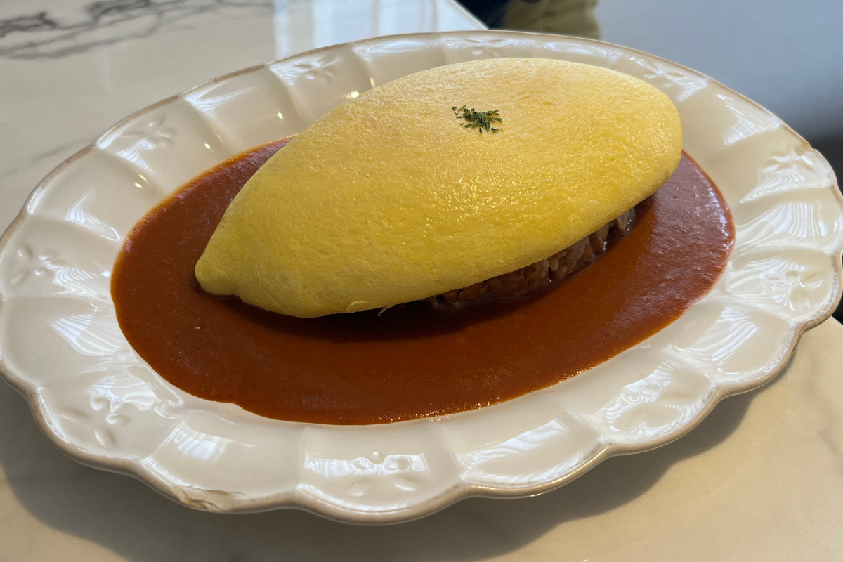 Cuando se sirve el omurice, pide al camarero que grabarás un video. Una vez que partas la tortilla por la mitad, encontrarás los huevos revueltos cubriendo el arroz. Es mejor mezclar bien el arroz con la salsa antes de comer para disfrutar completamente los sabores. Los huevos son conocidos por su textura increíblemente suave, ¡lo que añade a la singularidad del plato!