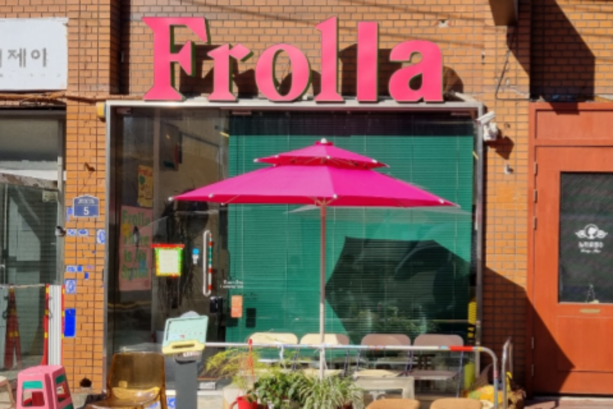 Frolla es una cafetería de moda. Tomarse una foto frente a esta cafetería se ha vuelto popular en las redes sociales. El vibrante letrero rosa intenso añade un toque hermoso, haciéndola conocida como un lugar popular para fotos.