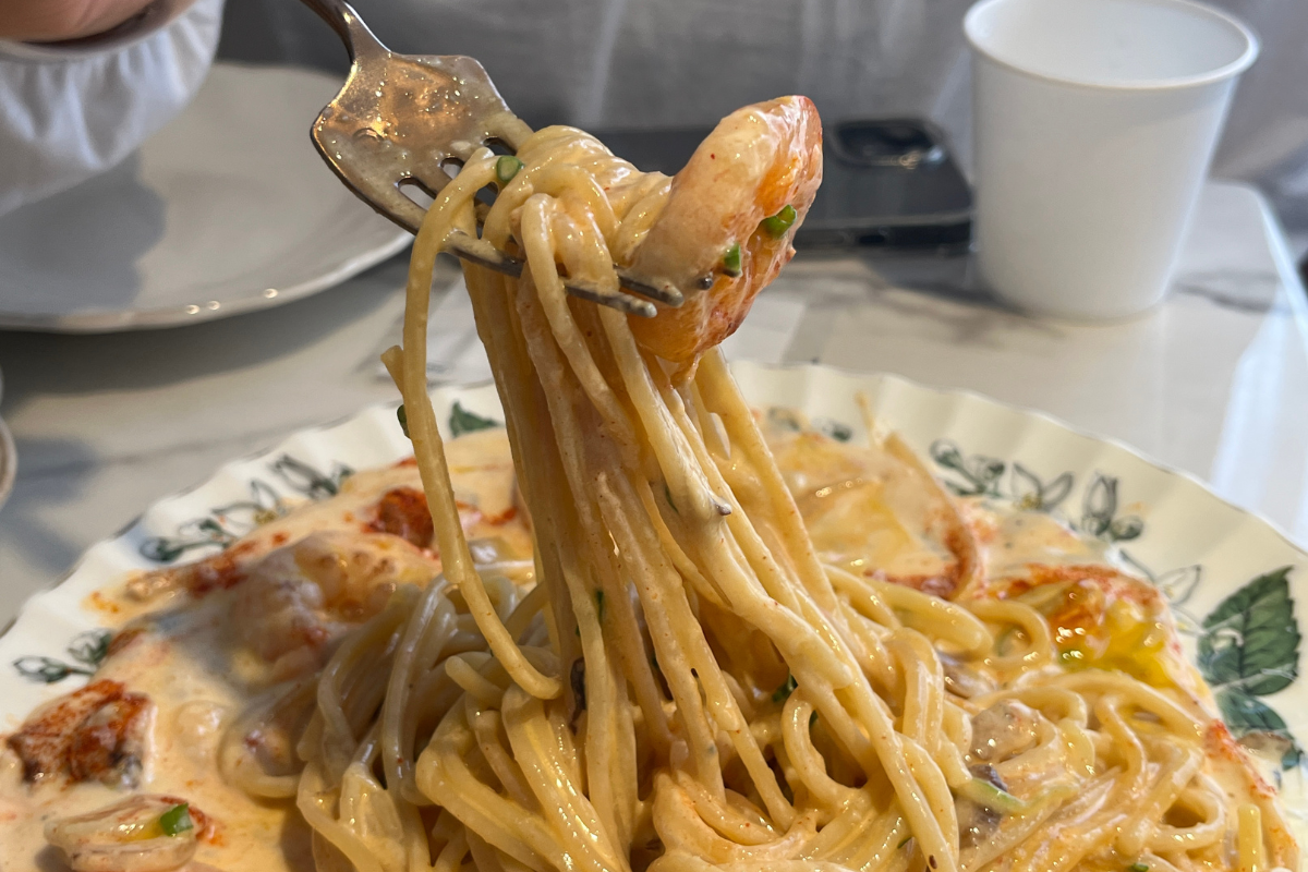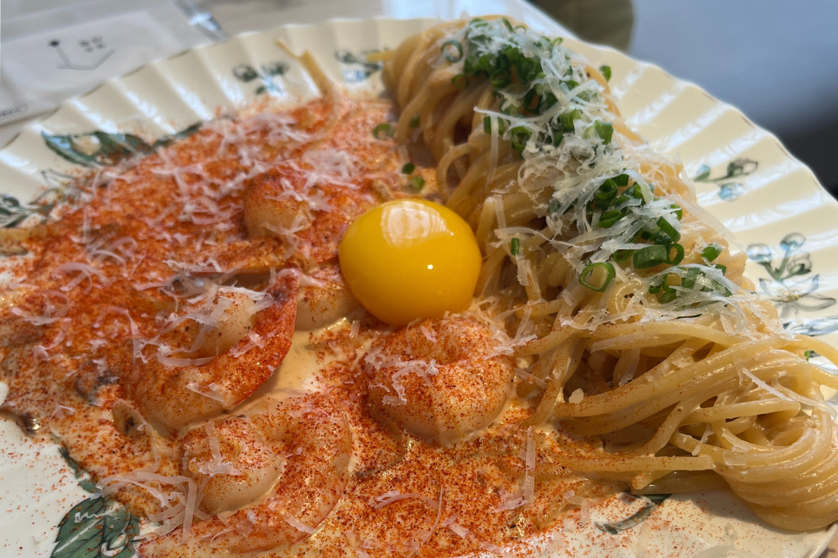 El menú más recomendado es la Pasta con Crema Picante, ¡y personalmente sentí que era el plato más delicioso! Esta pasta cremosa viene con coberturas de queso, camarones y huevo, creando un equilibrio perfecto de picante y riqueza que te deja queriendo más.