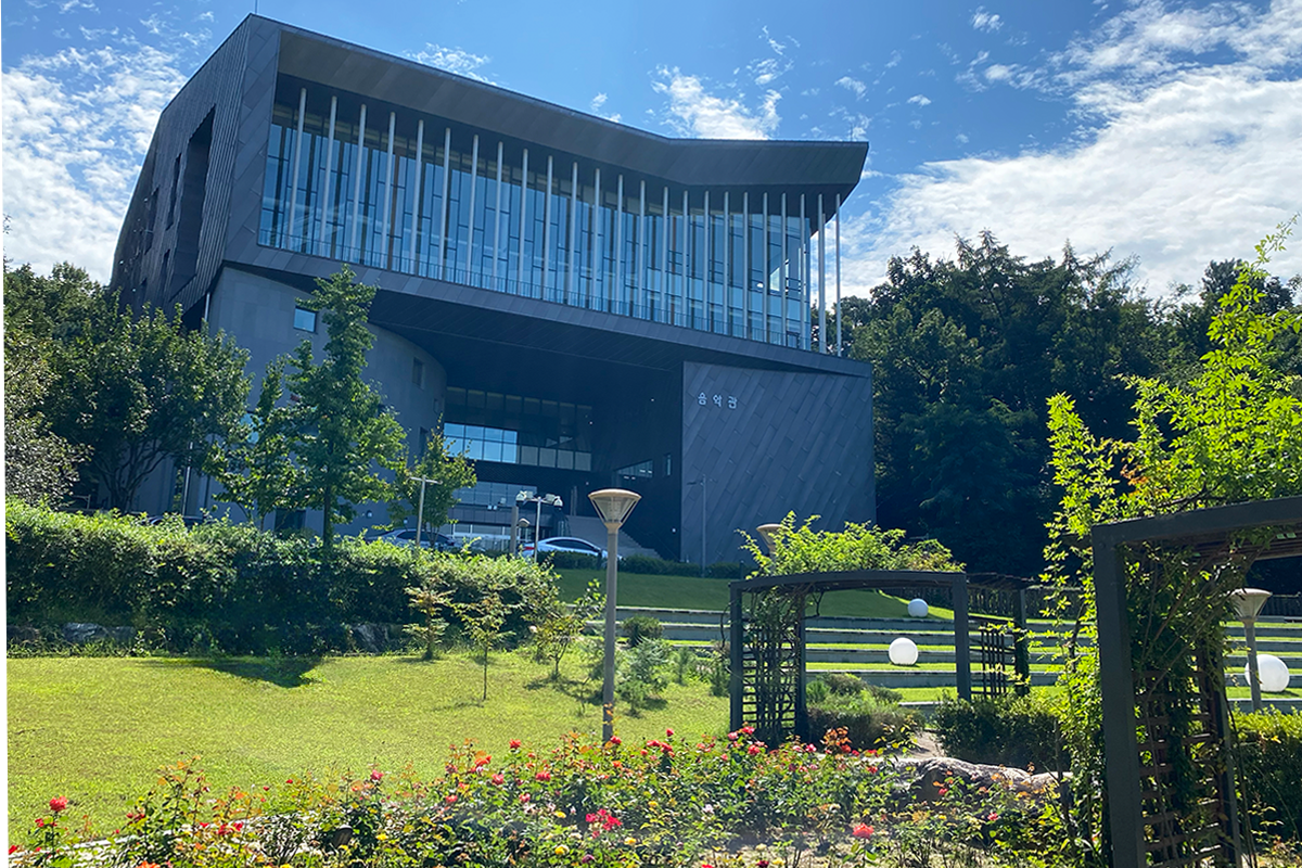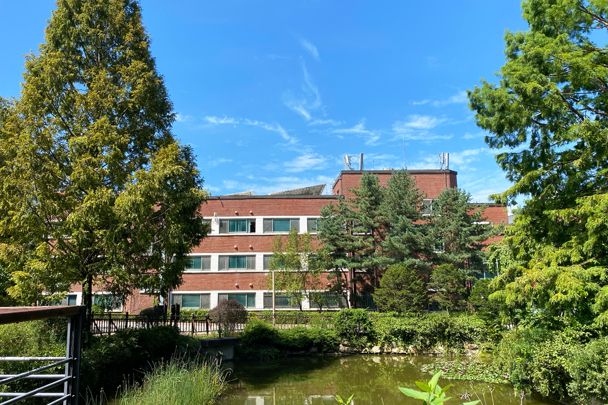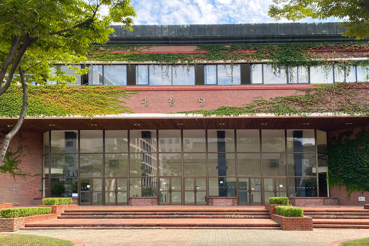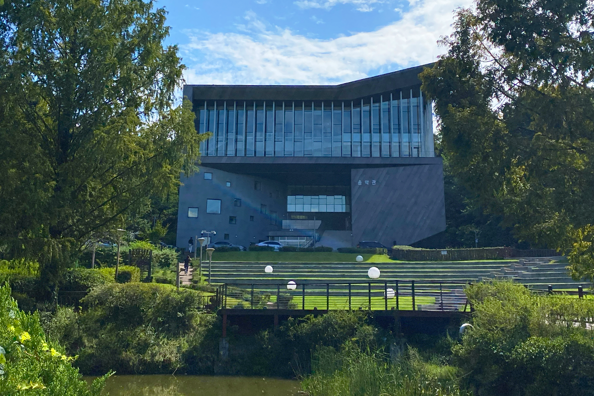Después del salón de música y el lugar de espectáculos al aire libre, caminando junto al lago, encontrarás el Liberal Arts Building(인문회관).