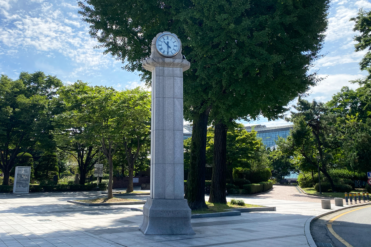 Pero hay una escultura llamada '시대탑' en la puerta principal, y cuando veas este símbolo de 'persona', sabrás que la Universidad de Seúl comienza desde aquí.