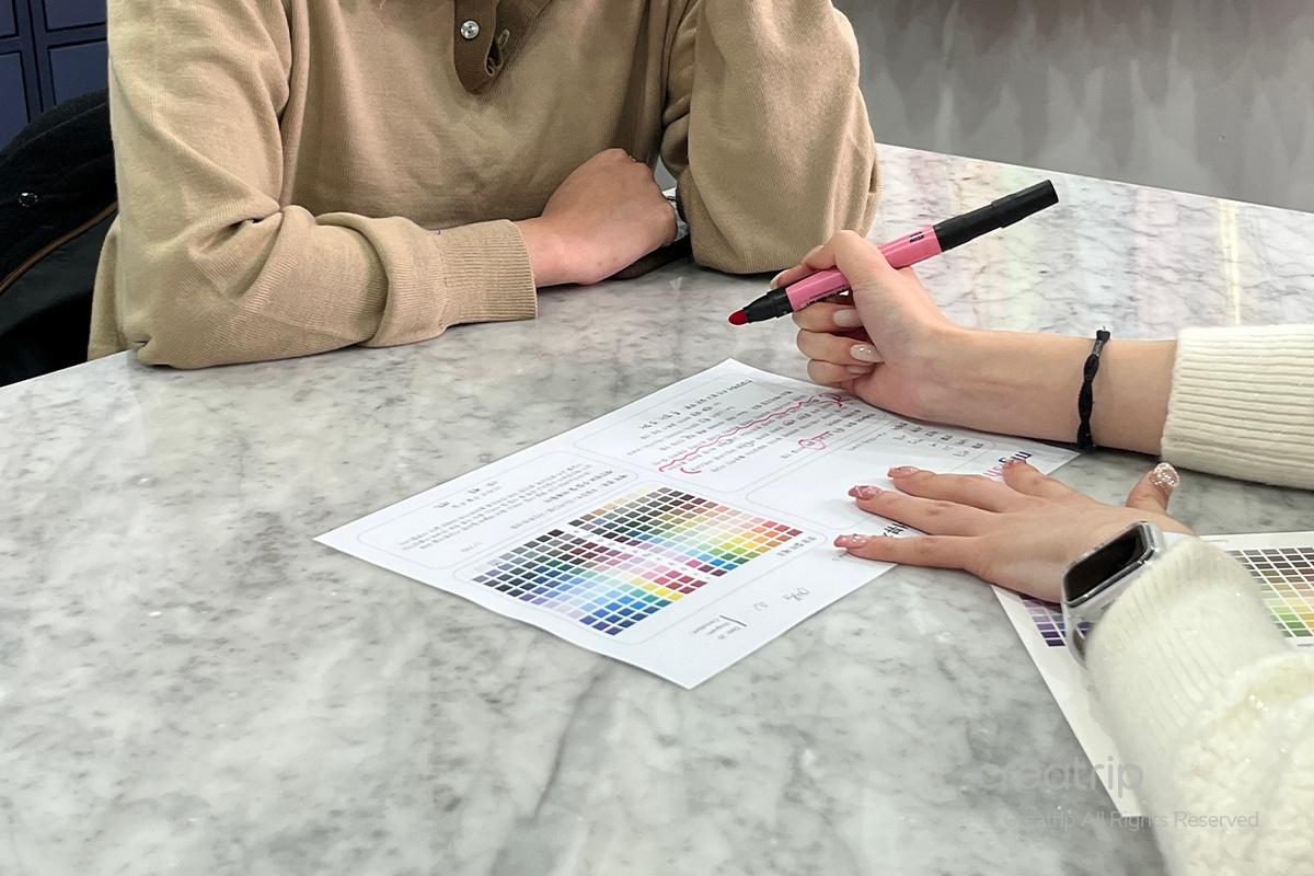 En el interior, se exhiben varias cartas de colores y telas de colores. Entre las muchas opciones que ofrecen, he decidido elegir la sesión 'Color Personal + Maquillaje 1:1'.