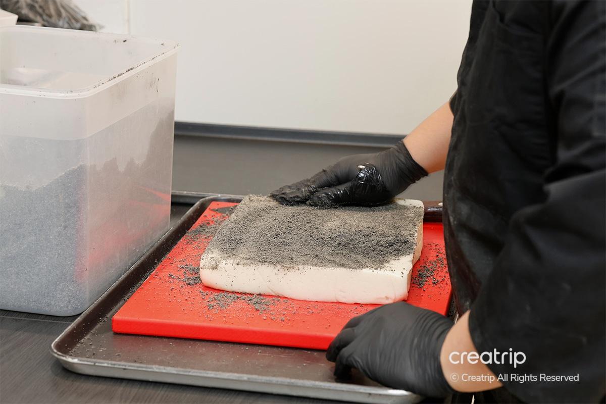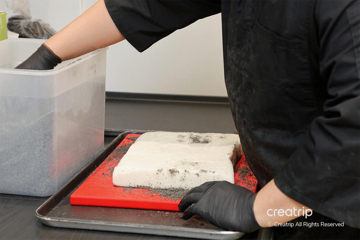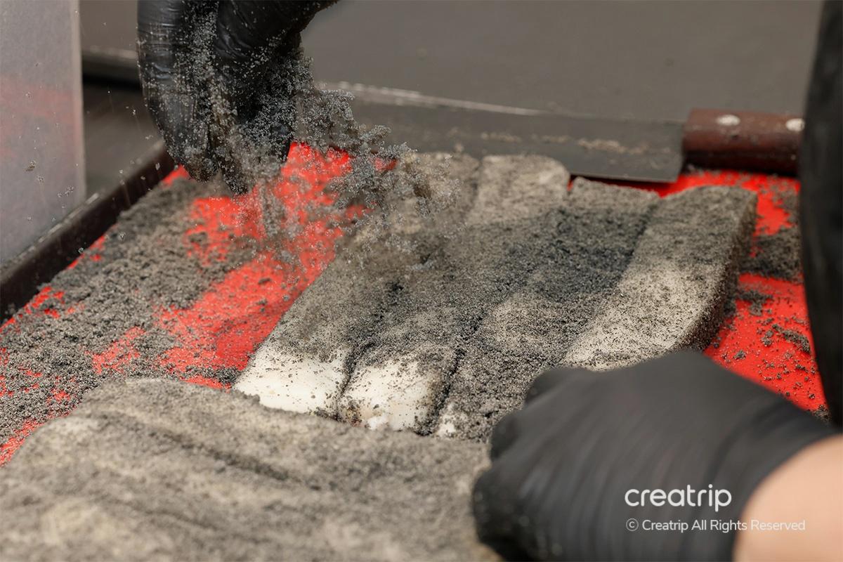 La caja está forrada con polvo de sésamo negro, con injeolmi cortado meticulosamente colocado en la parte superior. Verlos cubrirlo generosamente hasta el último momento fue impresionante. Verlo fresco y hecho en el lugar lo hizo aún más confiable y agradable.