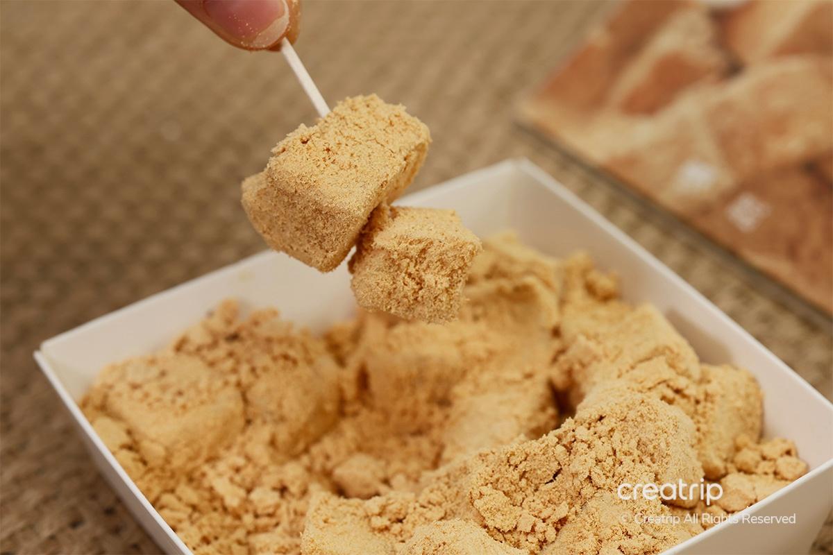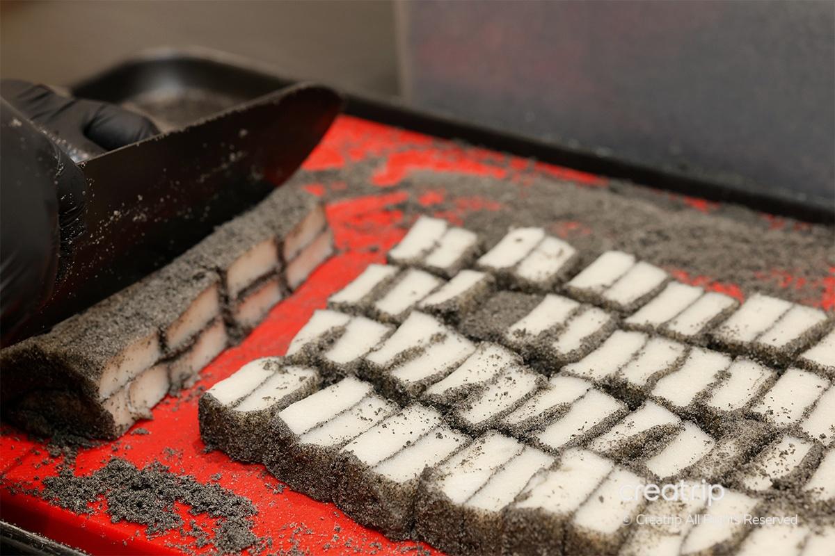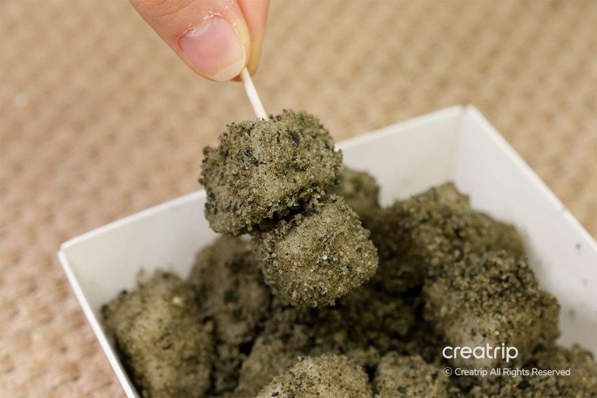 Hechos con arroz glutinoso local, estos pasteles de arroz blancos suaves y masticables están generosamente cubiertos con polvo de sésamo negro y cortados ordenadamente.
