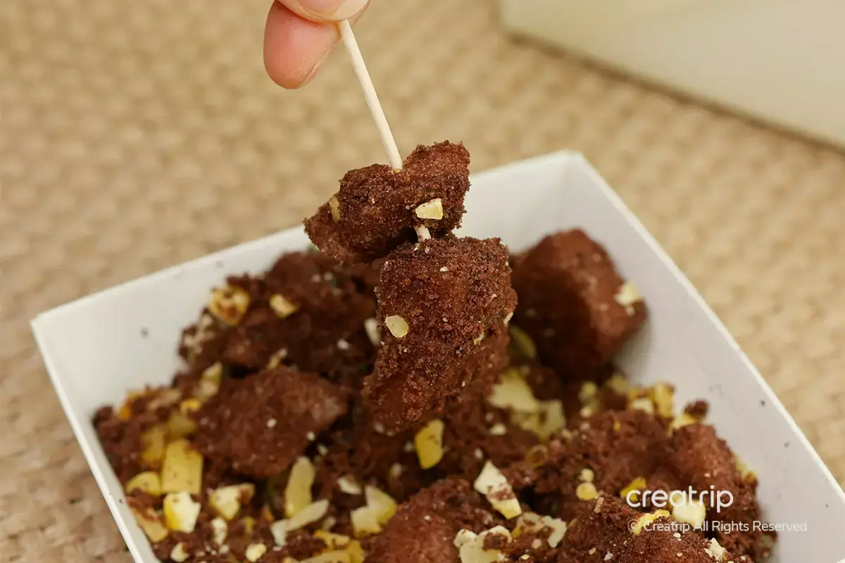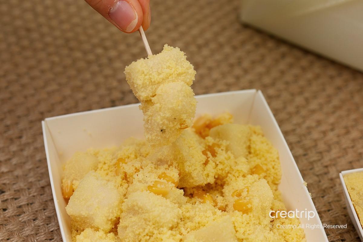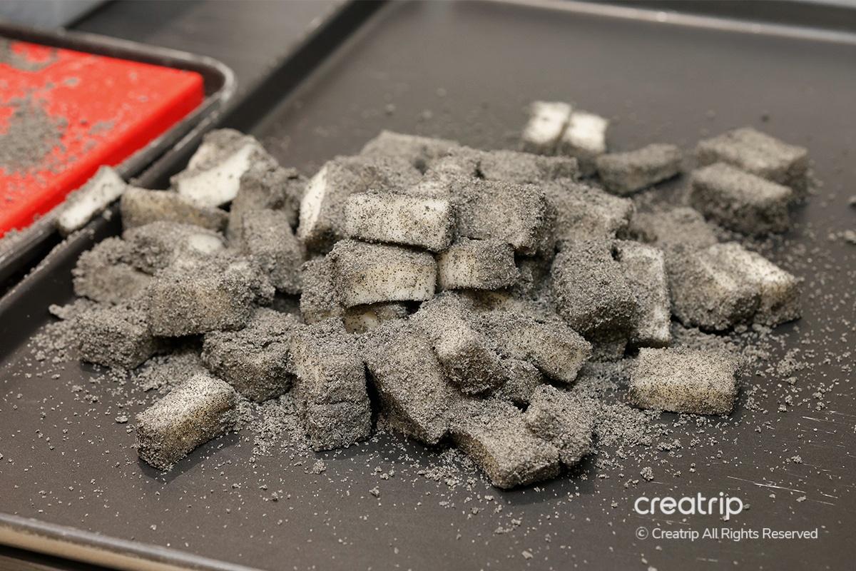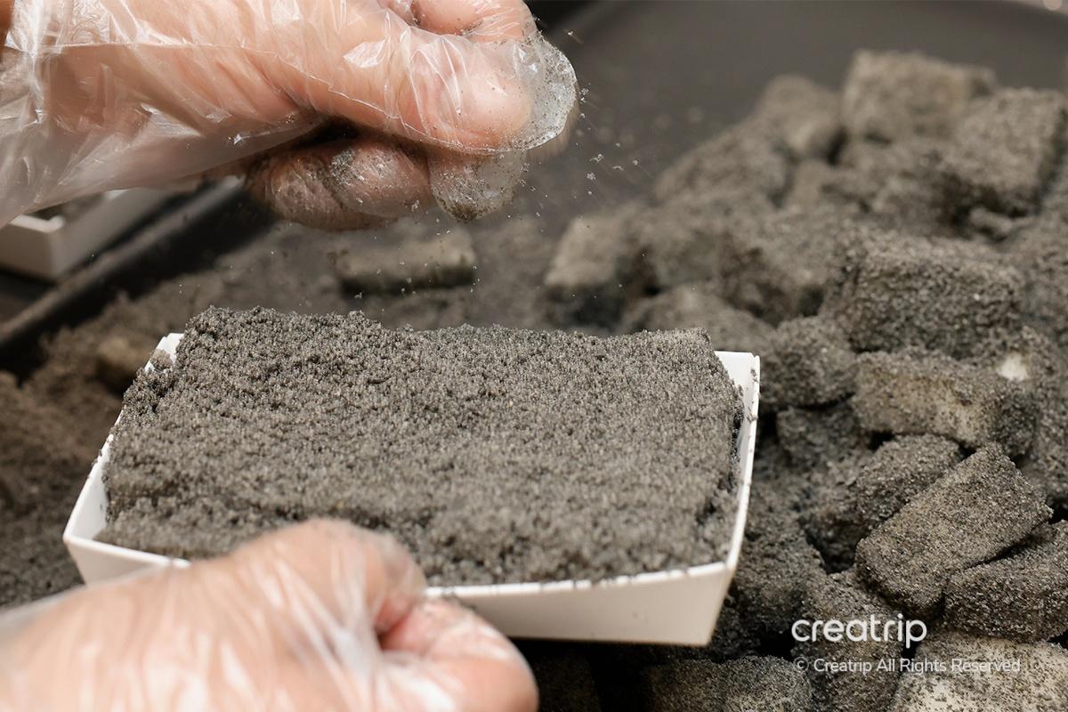 Hechos con arroz glutinoso local, estos pasteles de arroz blancos suaves y masticables están generosamente cubiertos con polvo de sésamo negro y cortados ordenadamente.