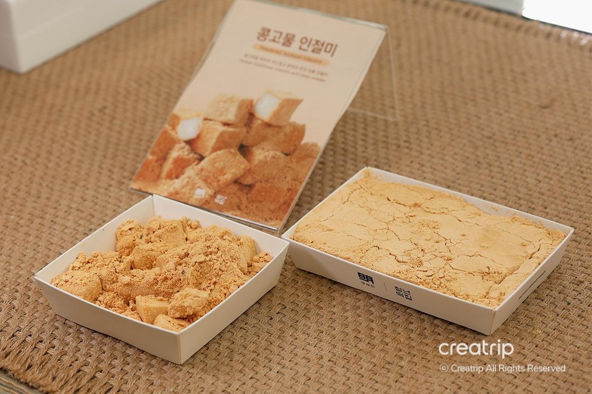 Probé Kongomul Injeolmi, un pastel de arroz tradicional coreano cubierto con polvo de soja. La textura masticable y suave hizo que se sintiera como si se derritiera en mi boca.