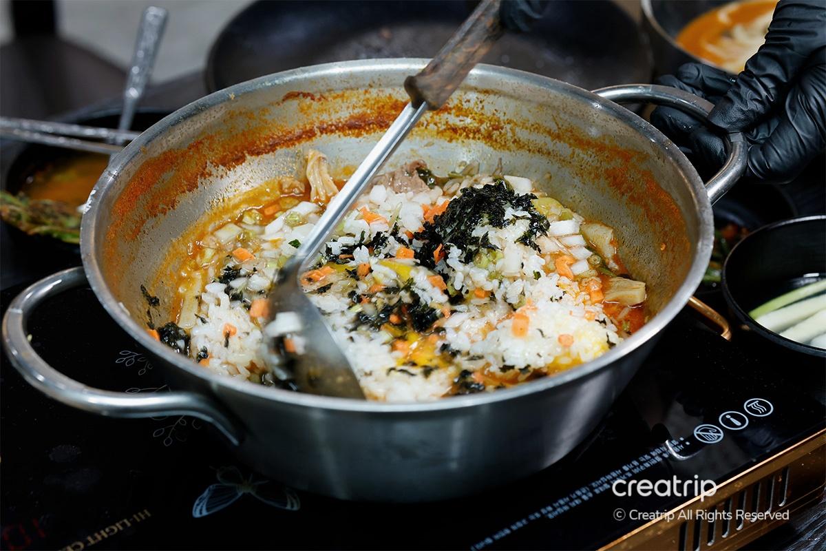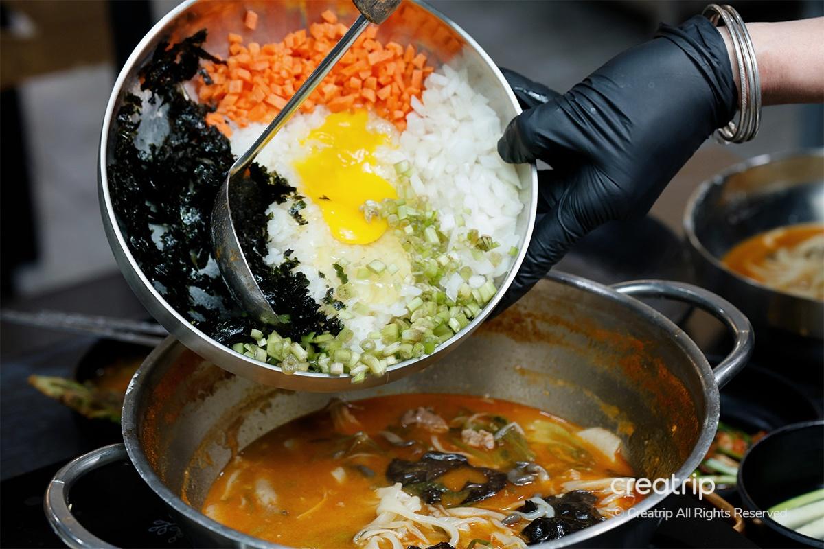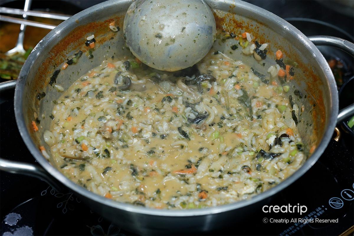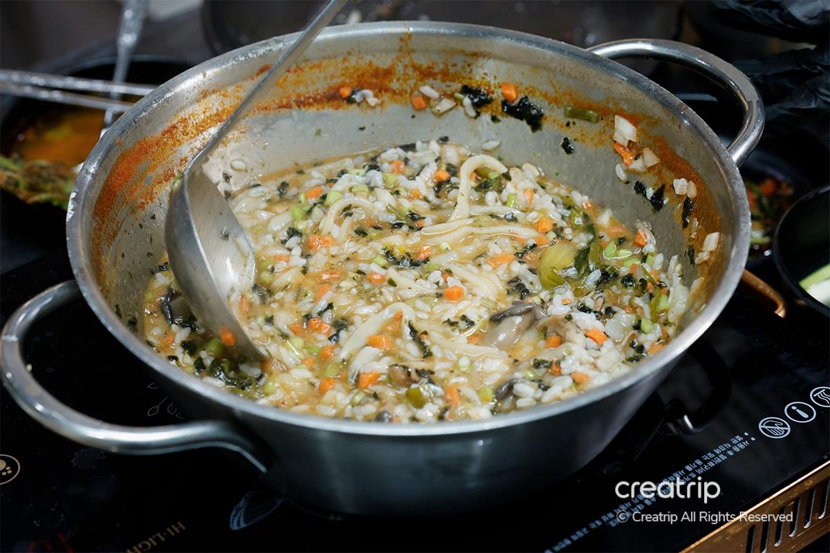 En Corea, después de terminar el shabu-shabu, es esencial hacer una papilla cocinando lentamente arroz, huevo y copos de alga en el caldo rico infusionado con carne y verduras.