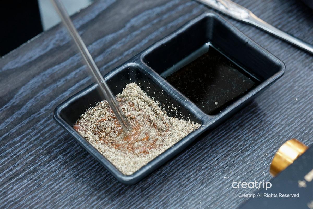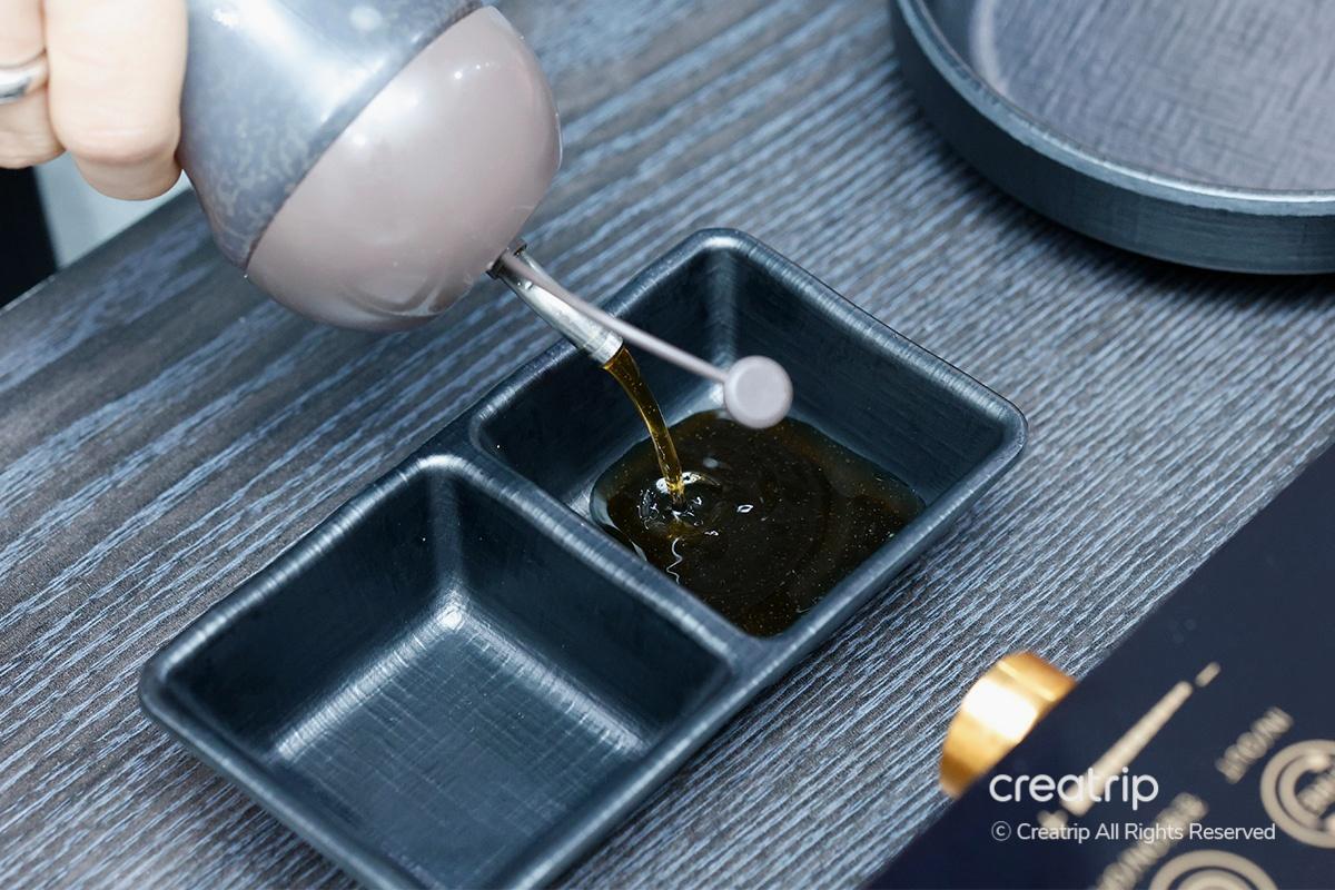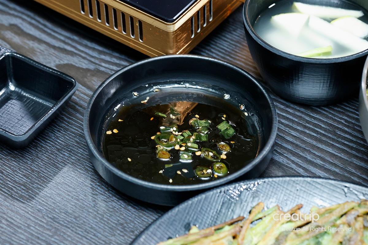 La tortita de minari incluida en el menú del set y la salsa de soja especial se sirvieron juntas.