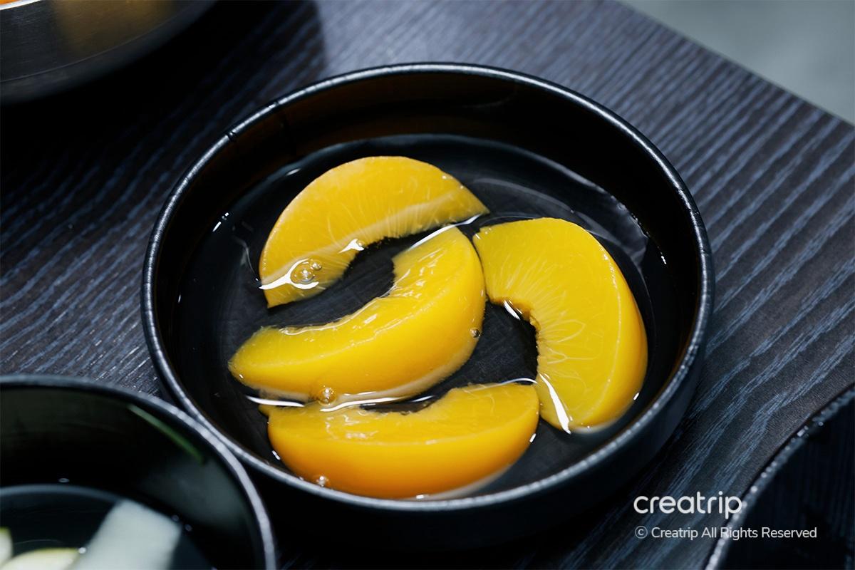 Después de disfrutar todos los platos, tomé postre con los duraznos amarillos preparados en la barra de autoservicio.