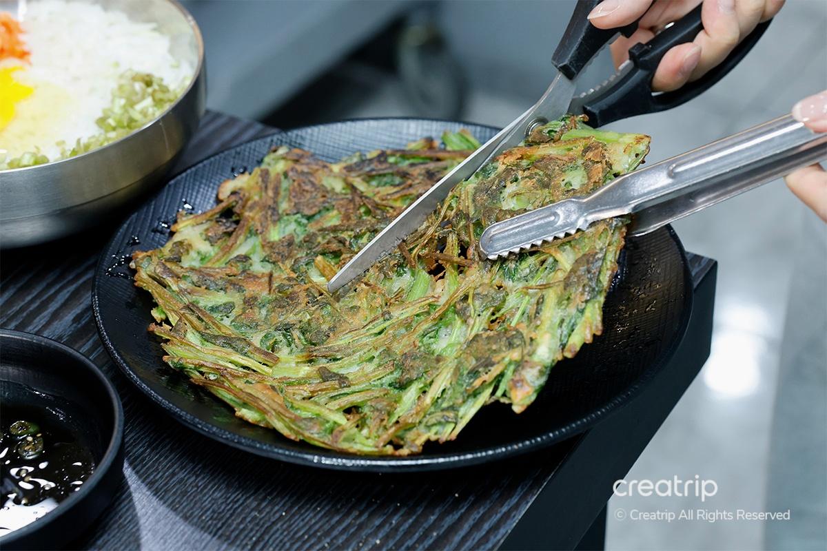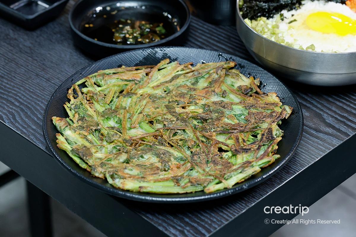 Probé el pancake de minari primero mientras las verduras se cocinaban.