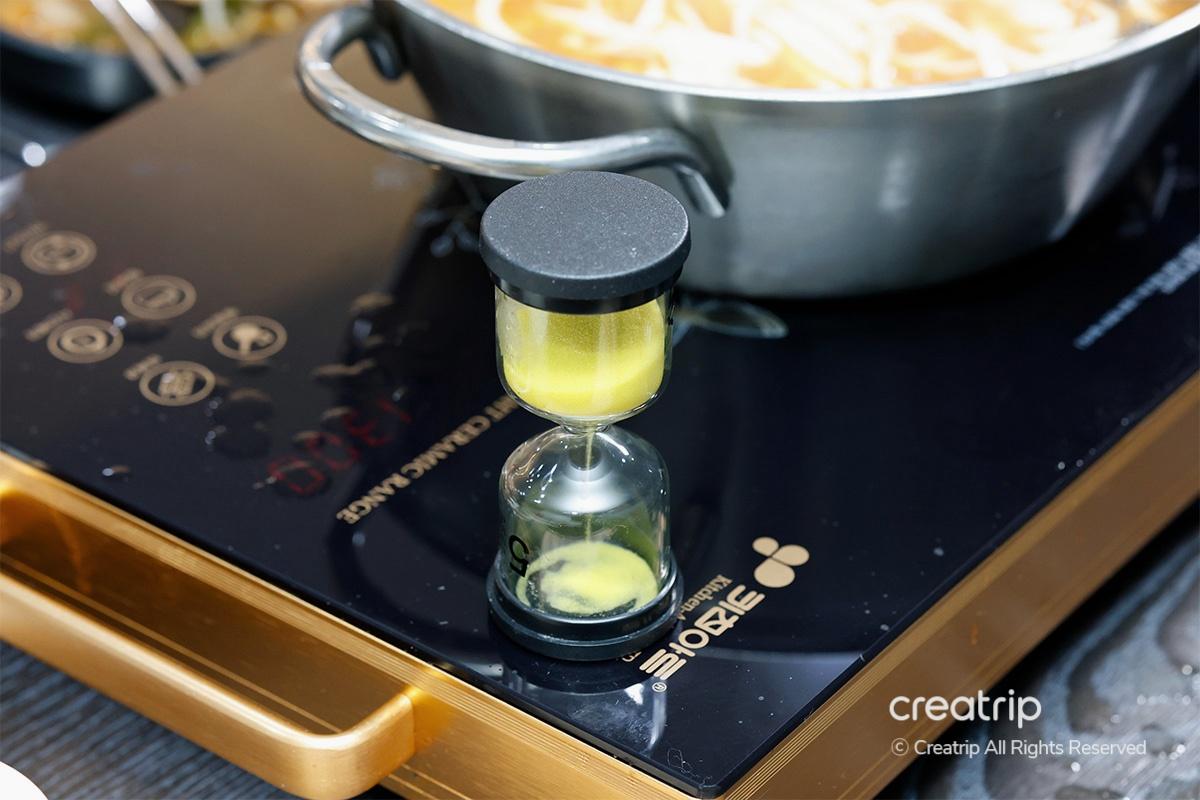 Voltee el reloj de arena sobre la mesa y disfrute su comida después de 5 minutos.