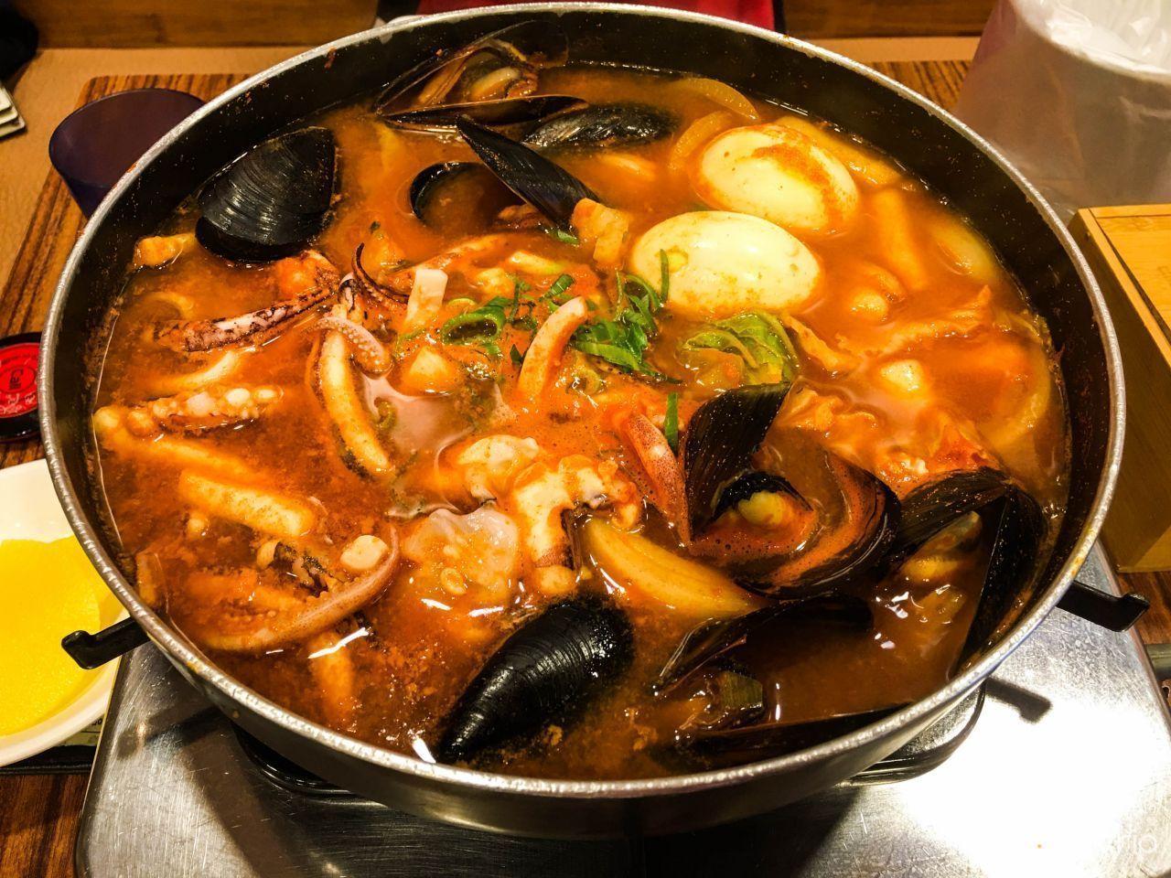 Prueba el estofado de mariscos ligeramente picante y tofu suave (해물순두부) por ₩9,000. Es una excelente manera de recargar energías entre o después de un largo día. Vierte una cucharada de tofu empapado en sopa sobre arroz, mézclalo bien y toma un gran bocado con kimchi y otros banchans para saborear una gran variedad de sabores.