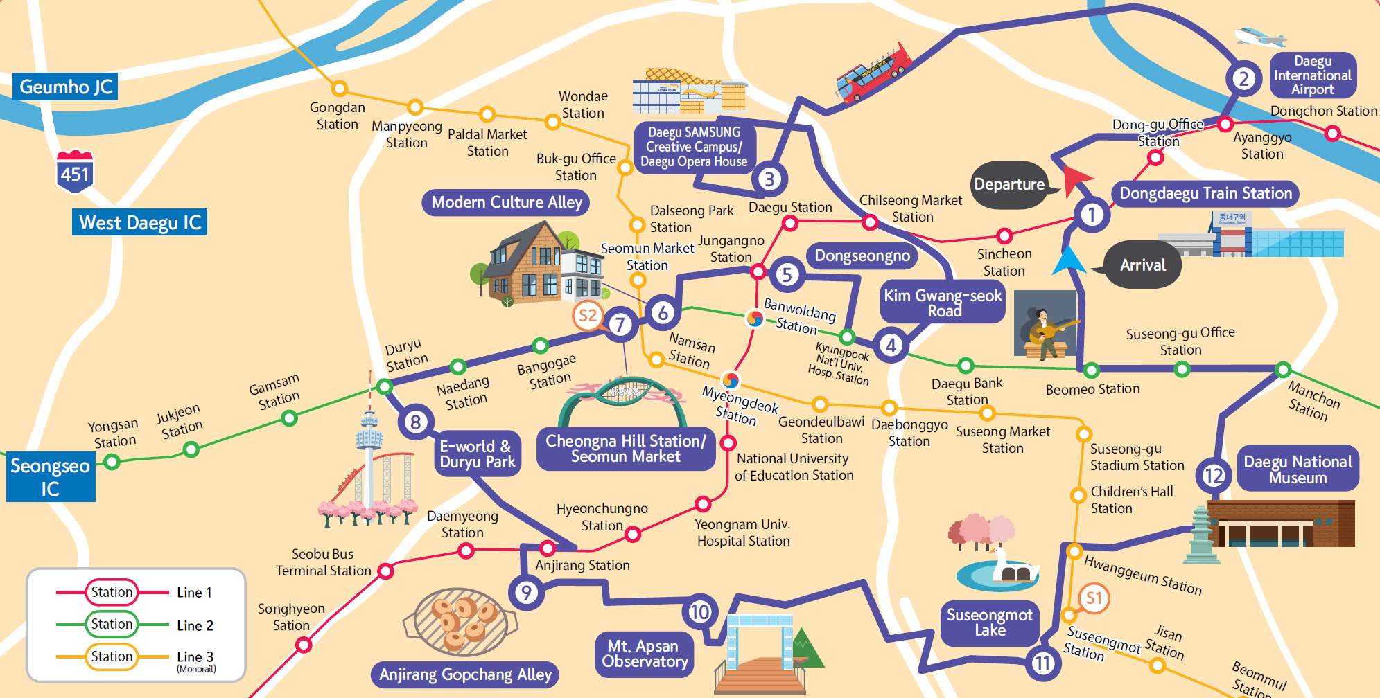 Paradas : Dongdaegu Station → Aeropuerto Internacional de Daegu → Samsung Creative Campus / Opera House → Calle Kim Kwang Seok → Dongseongro → Callejón de la Historia Moderna → Estación Cheongnaeondeok/Mercado Seomun → E-World/Parque Duryu → Calle Anjirang Gopchang → Observatorio Apsan → Suseongmot → Museo Nacional de Daegu → Dongdaegu Station (Circulación)