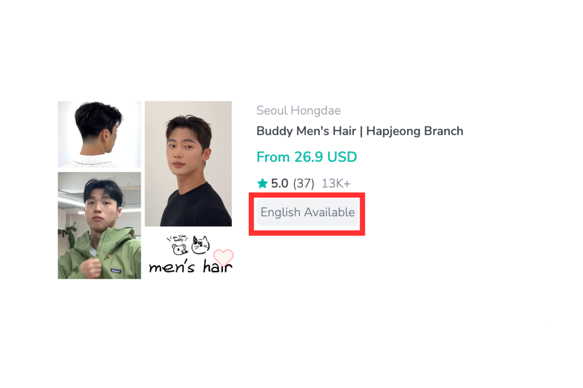 A: Las peluquerías normalmente no ofrecen servicios de traducción, pero las peluquerías en zonas populares y barrios turísticos como Hongdae y Yeonnam pueden tener personal o estilistas que hablen inglés. Si quieres asegurarte de que haya servicio en un idioma específico, puedes reservar a través de Creatrip, ¡se indicará en el anuncio!