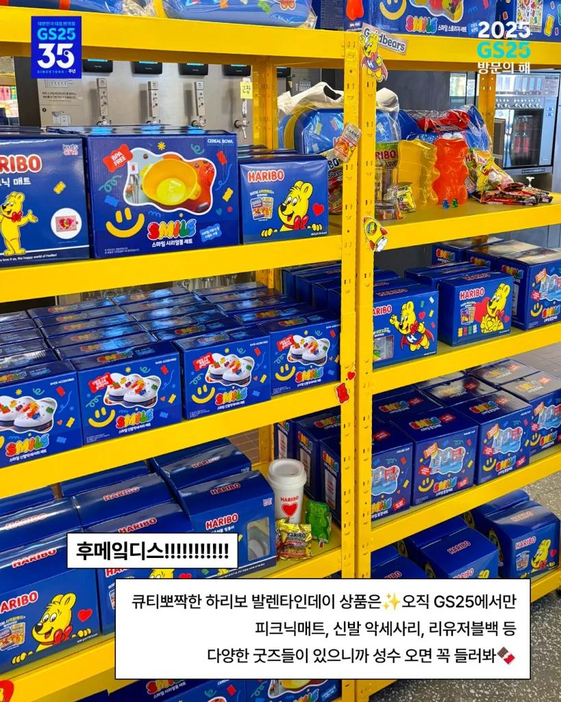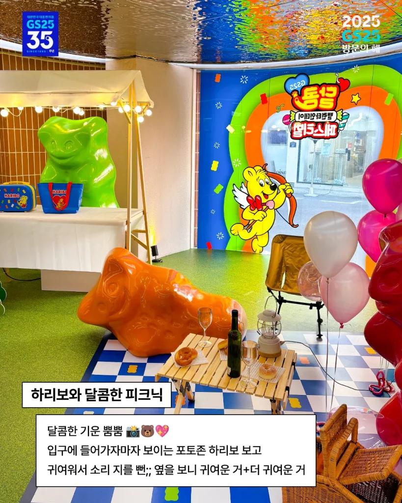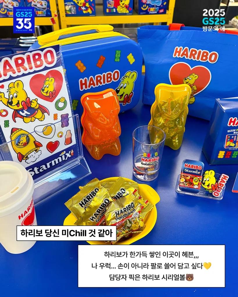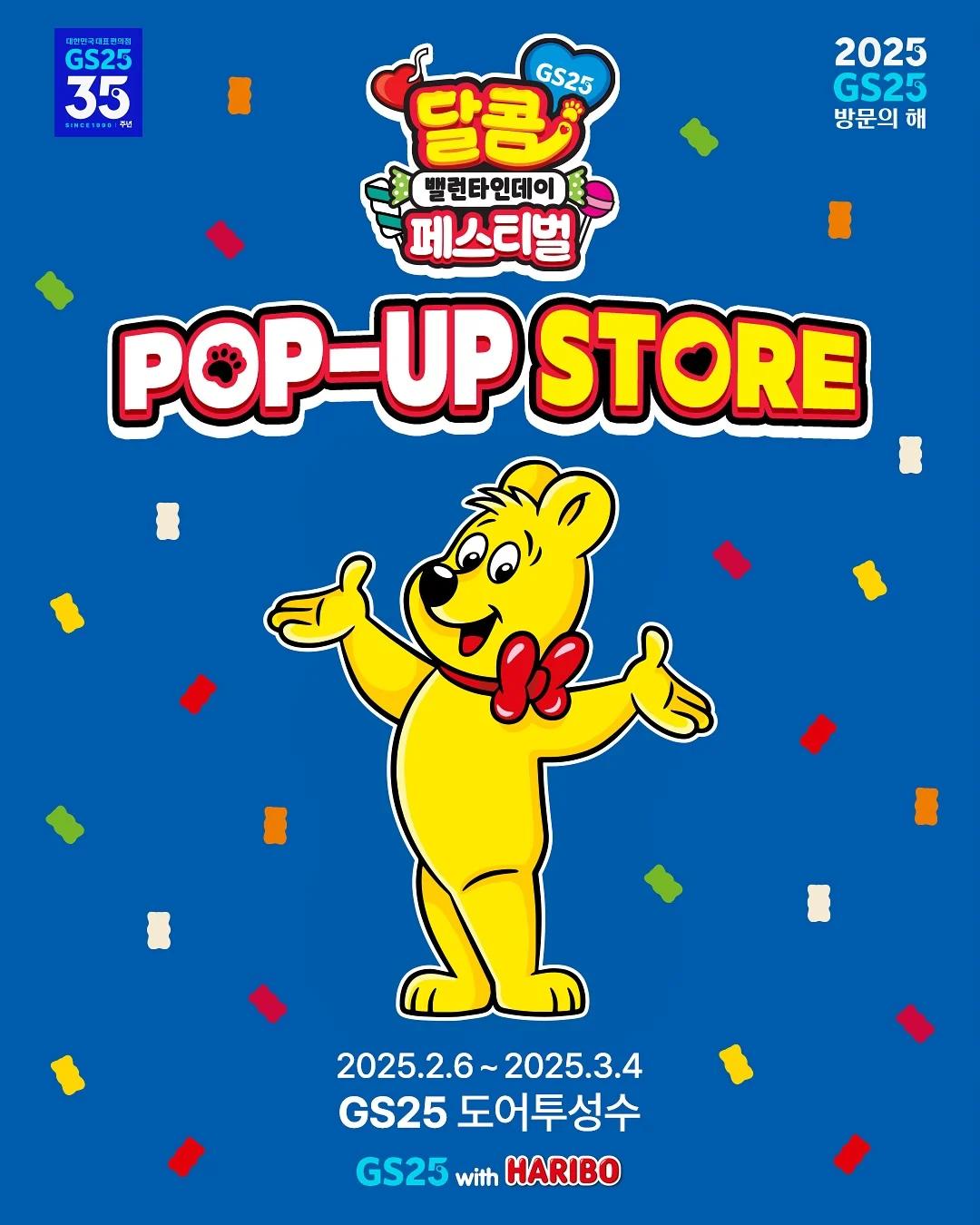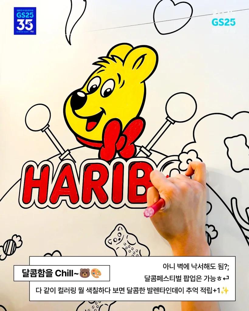 便利商店 GS25 與全球果凍品牌 'Haribo' 合作在聖水洞開設快閃店。可重複使用的隨行杯、水杯、袋子、野餐墊、冰箱磁鐵、卡貼、迷你攜帶盒及更多合作產品供應。享受在可愛的Haribo拍照區拍照或在著色牆上著色吧!