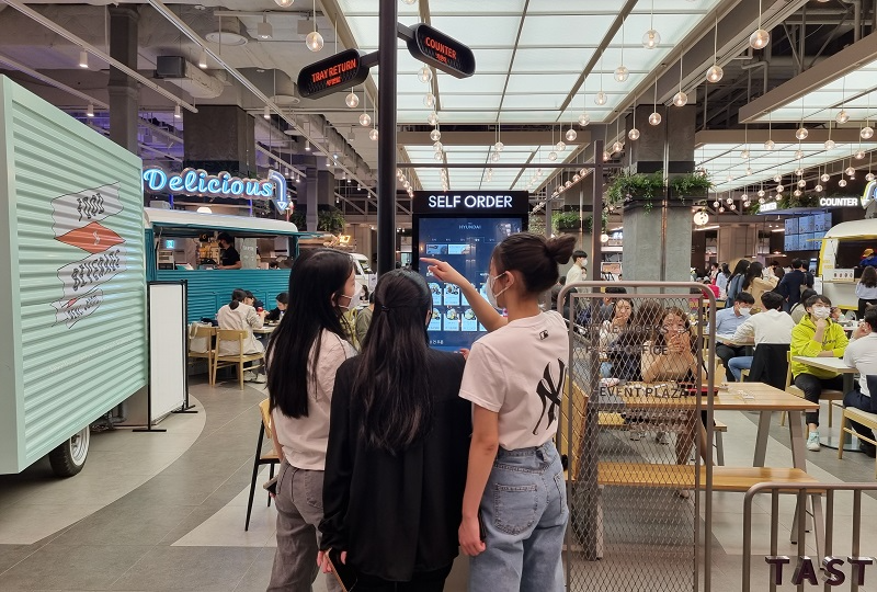 Vous pouvez commander vous-même au kiosque à l'entrée de la cour de restauration, ou au comptoir au milieu. Seules les cartes peuvent être utilisées au kiosque, alors veuillez utiliser le comptoir pour les paiements en espèces.
