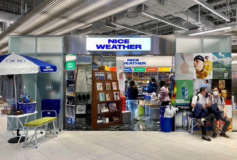 Nice Weather est une boutique de sélection populaire parmi les jeunes générations en Corée. C'est une boutique lifestyle qui vend de la nourriture, des boissons, des vêtements, des articles divers et est conçue dans le concept d'un magasin de proximité.