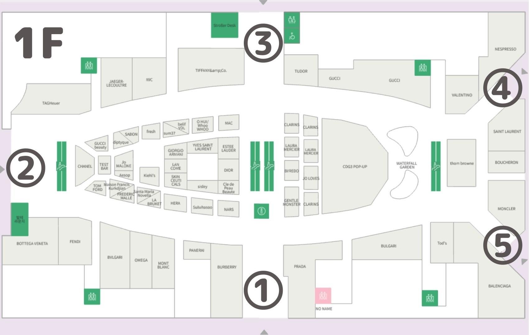 Le premier étage de The Hyundai Seoul est l'étage des produits de luxe. Cet étage se compose de marques telles que Gucci, YSL et Gentle Monster.