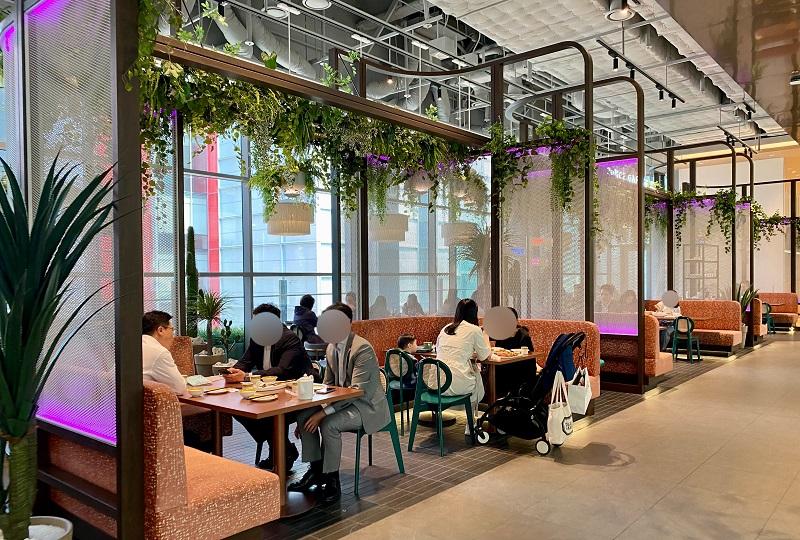 Le restaurant propose de nombreux sièges ouverts où vous pouvez admirer la ville de Yeouido à l'extérieur ainsi que l'intérieur du centre commercial ! Vous pouvez déguster de délicieux plats tout en profitant du panorama de la ville !