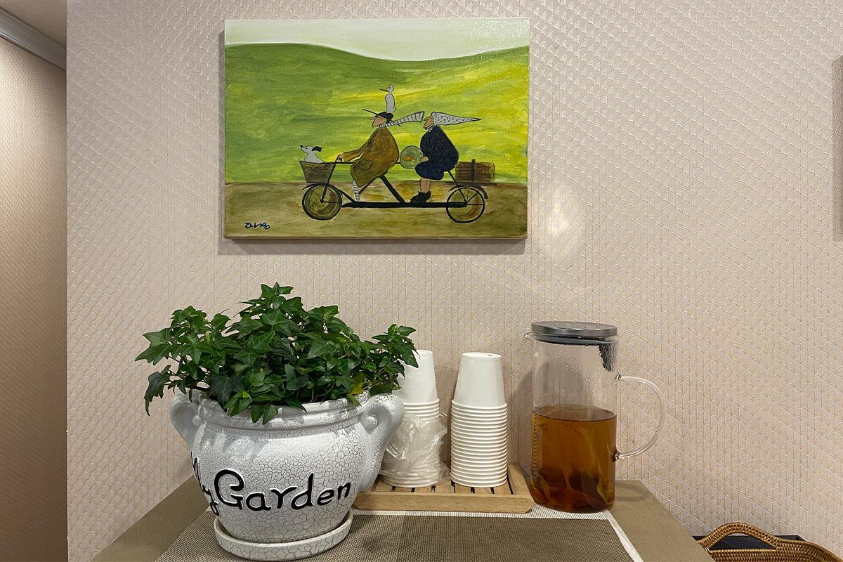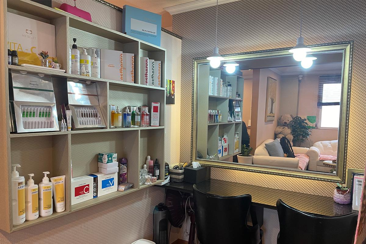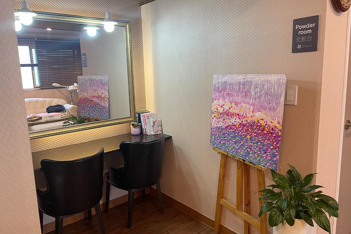 Il y a une table de maquillage et des produits de soin placés au centre du magasin. Le tableau placé sur le côté droit se reflète dans le miroir, créant une sensation comme si elle était dans un musée d'art.