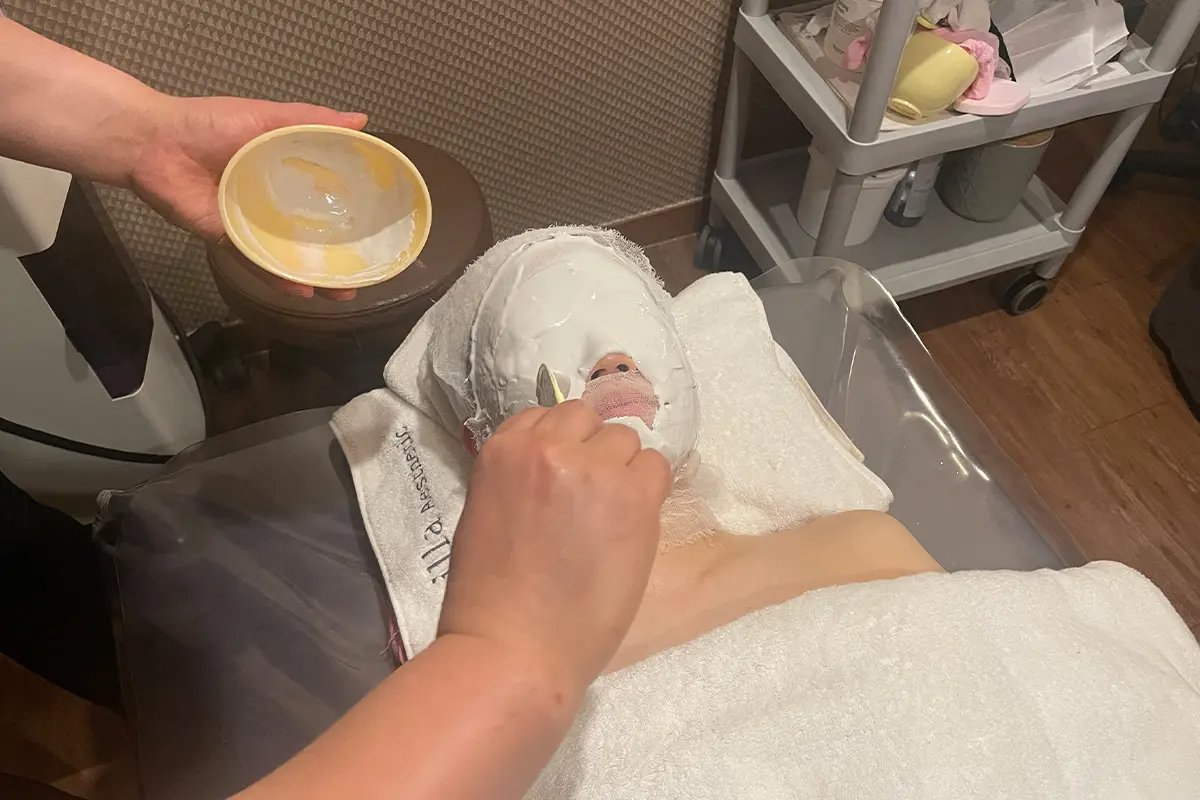 Enfin, ils ont appliqué un masque de plâtre, qui est un masque de collagène. Ce masque est conçu pour éliminer les impuretés et les toxines accumulées sur le visage tout en procurant un effet apaisant à la peau. Après avoir appliqué le masque de plâtre, ils ont procédé à une thérapie par LED. Le masque de plâtre aide les ingrédients à pénétrer plus profondément dans la peau, tandis que la thérapie par LED a divers effets tels que l'amélioration des rougeurs et de l'apparence des pores.