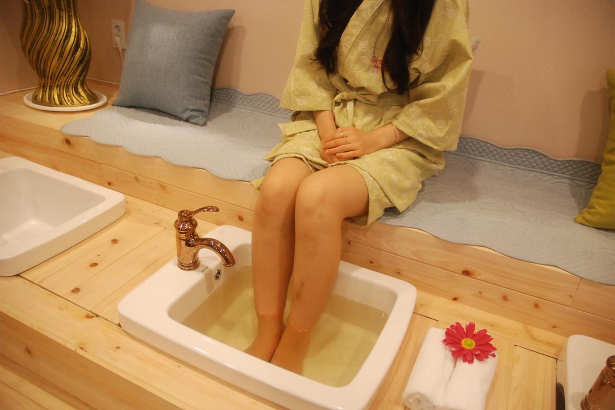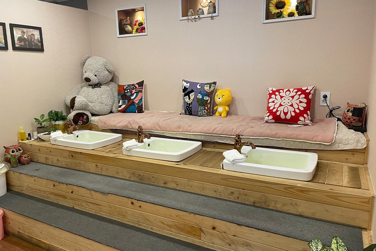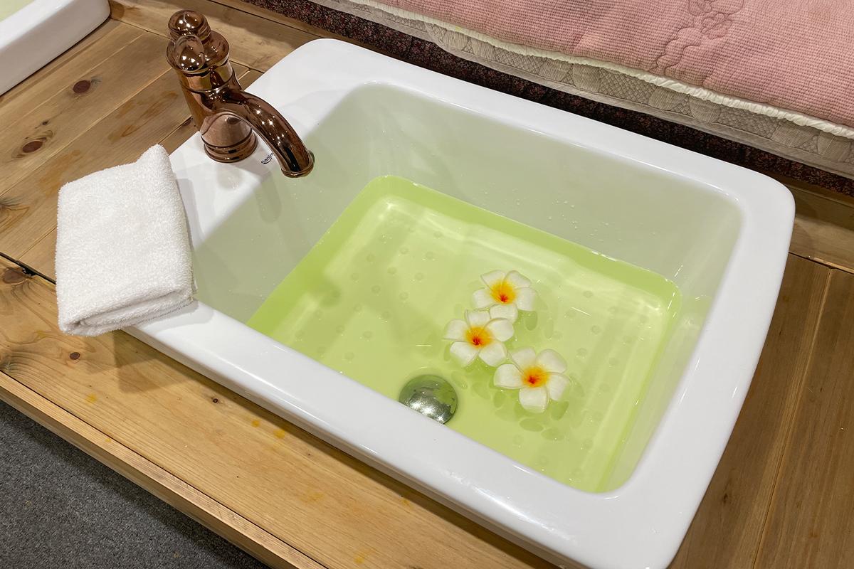 J'ai reçu des soins pour les pores et le blanchiment, et d'abord, ils m'ont conduit à la zone de bain de pieds située à côté de la table de maquillage pour un spa des pieds. Il s'agit du bain de pieds situé à côté de la table de maquillage. De l'huile de citronnelle est généreusement ajoutée, donc lorsque vous trempez vos pieds dans le bain, le parfum de l'huile est fortement ressenti, procurant du confort au corps et à l'esprit. Boire du thé chaud tout en trempant vos pieds vous permet de soulager la fatigue dans vos jambes accumulée pendant votre voyage.