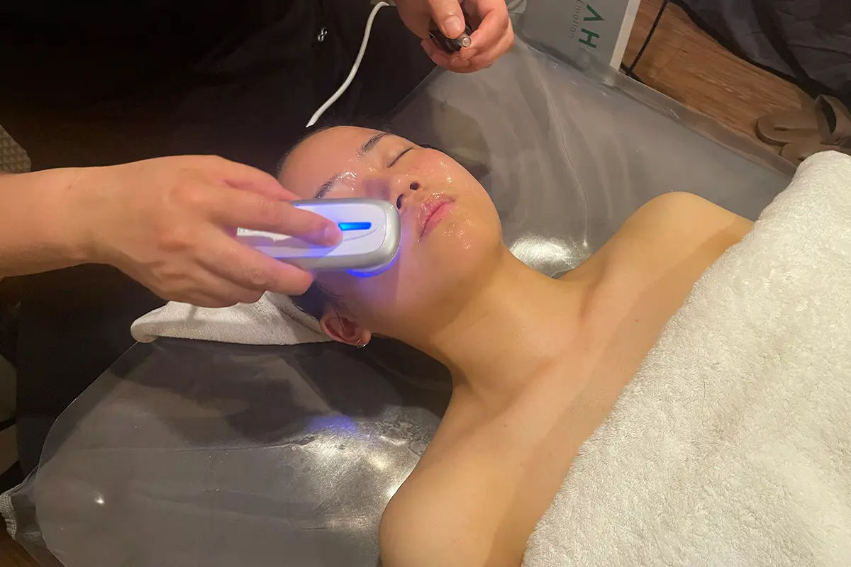 En continuant, ils ont effectué un lifting facial en utilisant Aqua Wrap. Aqua Wrap implique l'utilisation de trois solutions spéciales qui sont appliquées aux pores, les ouvrant et permettant à la solution de pénétrer et de dissoudre les impuretés, les rendant plus faciles à éliminer. En termes plus simples, cela aide à éliminer le sébum et les points noirs présents dans les follicules faciaux ! En tant que personne à la peau sensible, mon éditeur a ressenti une légère sensation de chaleur dès son application, mais elle a rapidement disparu après la fin de la procédure de lifting. Après le traitement, en regardant dans le miroir, il y avait une réduction notable des points noirs tenaces qui ne disparaissent généralement pas facilement avec les masques habituels. C'était vraiment étonnant !