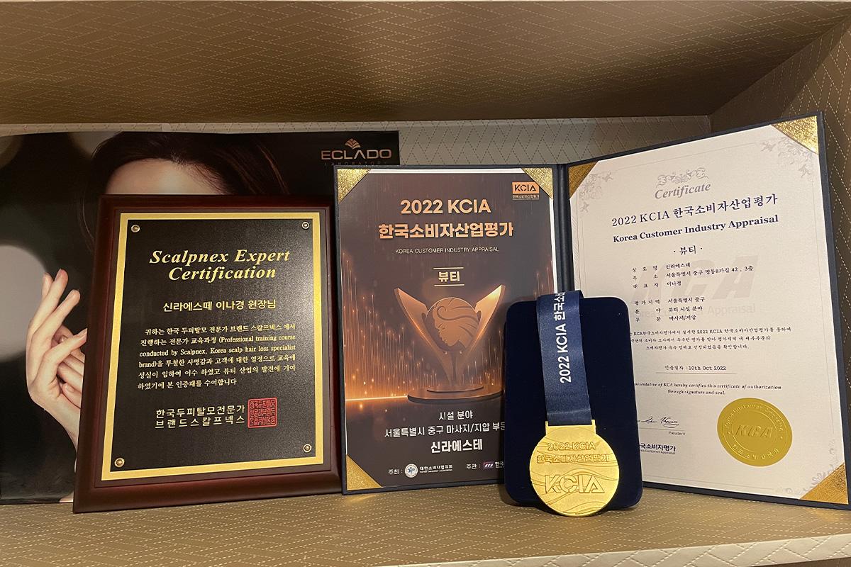 Shilla Esthetic a été sélectionné comme une entreprise exceptionnelle dans le secteur de la beauté de l'évaluation de l'industrie des consommateurs coréens 2022 KCIA. De plus, le fait d'avoir la licence de thérapeute en soins de la peau du directeur à côté augmente le niveau de confiance en tant que bonus supplémentaire!