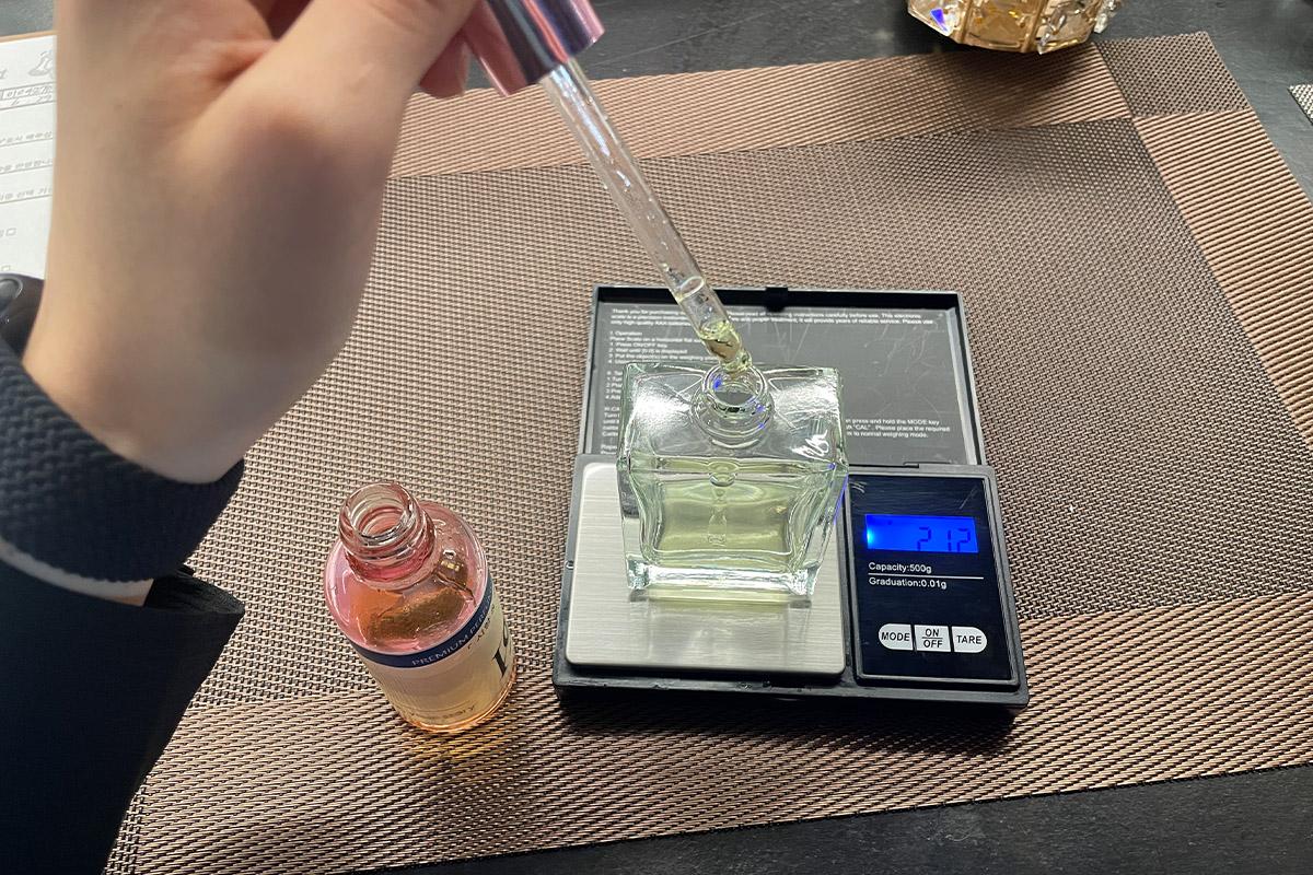 Ensuite, vous passerez à la combinaison des parfums en fonction de l'échantillon que vous avez choisi précédemment, en utilisant le flacon de parfum.Le coordinateur des parfums vous guidera sur le nombre de grammes de chaque parfum à mélanger pour chaque catégorie. Veuillez noter les quantités sur le tableau de fabrication de parfum.