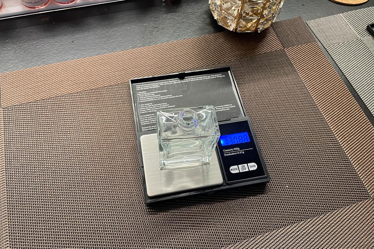 En utilisant l'échantillon comme guide, vous allez maintenant ajouter les matériaux de fragrance dans le flacon de parfum. Bien qu'une légère variation de quantité soit acceptable, il est important d'essayer de correspondre aux mesures en grammes aussi précisément que possible. Des écarts excessifs peuvent potentiellement changer le parfum final, alors veuillez vous efforcer de respecter les mesures en grammes spécifiées.