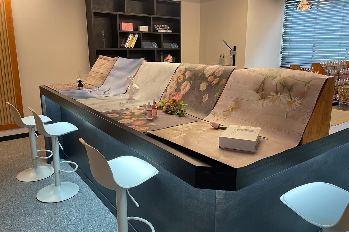 La table centrale de test de parfums est appelée la galerie Parfum. Ici, vous trouverez une collection de parfums de luxe premium méticuleusement mélangés par des parfumeurs européens expérimentés dans le but de créer des parfums haut de gamme.Ces senteurs ont été soigneusement sélectionnées et recréées par Parfum 9 pour offrir une expérience de parfum unique et raffinée.