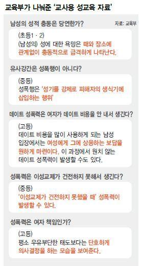 Beaucoup d'éducations sexuelles sont occupées à expliquer comment éviter les crimes sexuels plutôt que d'expliquer à quel point les délinquants sexuels sont mauvais. Il est vrai que la manière d'éviter est également importante. Cependant, le problème est que de nombreux manuels et vidéos nous enseignent que nous devrions dire 'Non !' et résister vigoureusement. Il est également inutile de dire que les femmes devraient éviter de porter des vêtements révélateurs. Si le vêtement était trop révélateur et stimulait le désir sexuel des délinquants, les délinquants ne devraient-ils pas être patients ? La forte tendance à minimiser les erreurs des délinquants est la réalité de l'éducation sexuelle en Corée. Ce qui suit est l'état actuel de l'éducation sexuelle coréenne discuté en ligne :