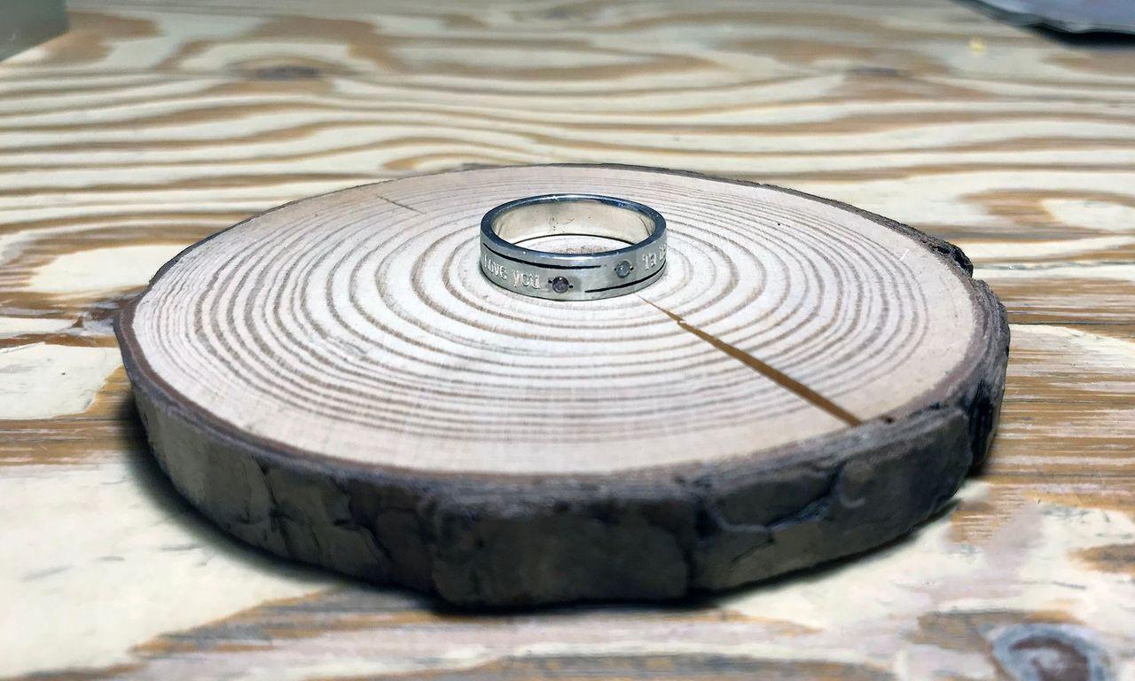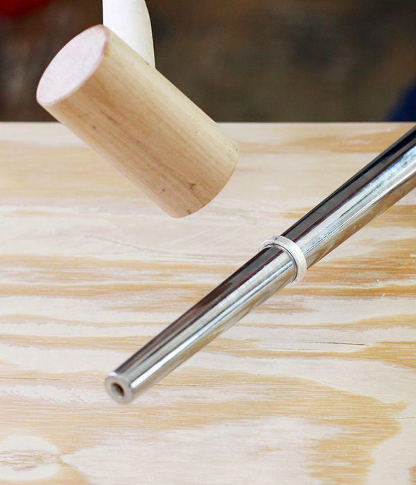 Après avoir terminé de faire le tour de l'anneau, vous placez l'anneau sur cette barre en métal et vous le frappez avec un marteau en bois pour l'ajuster à votre taille d'anneau.