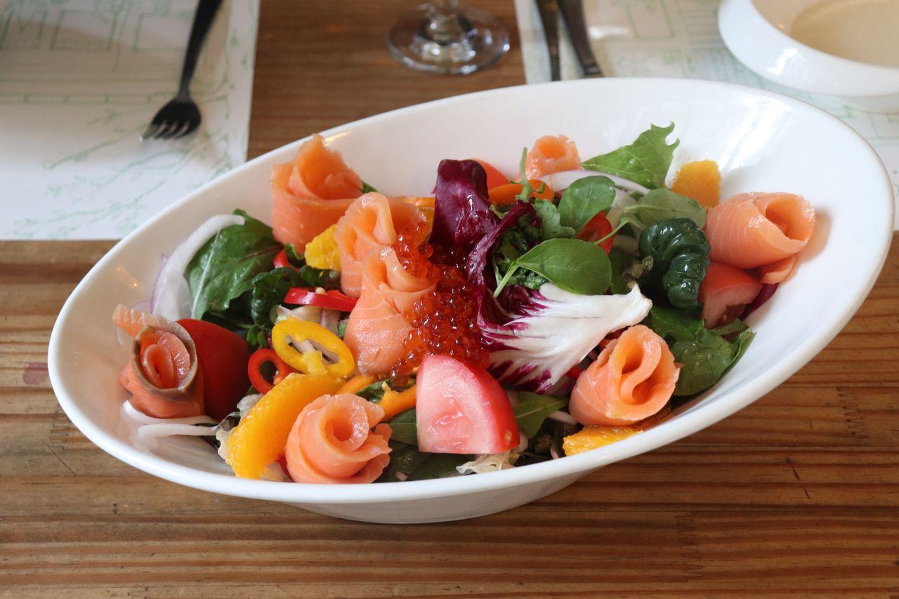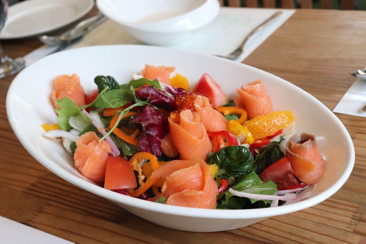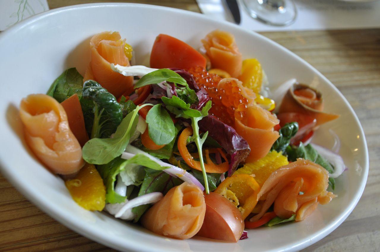 Le saumon est disposé pour ressembler à des fleurs. Je n'aime généralement pas les salades, mais j'ai vraiment aimé celle-ci de Urban Garden.