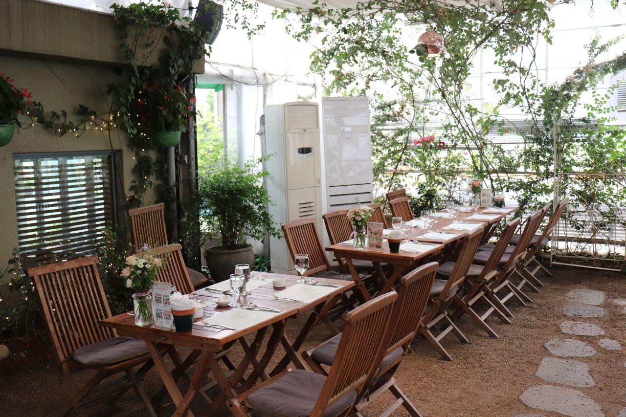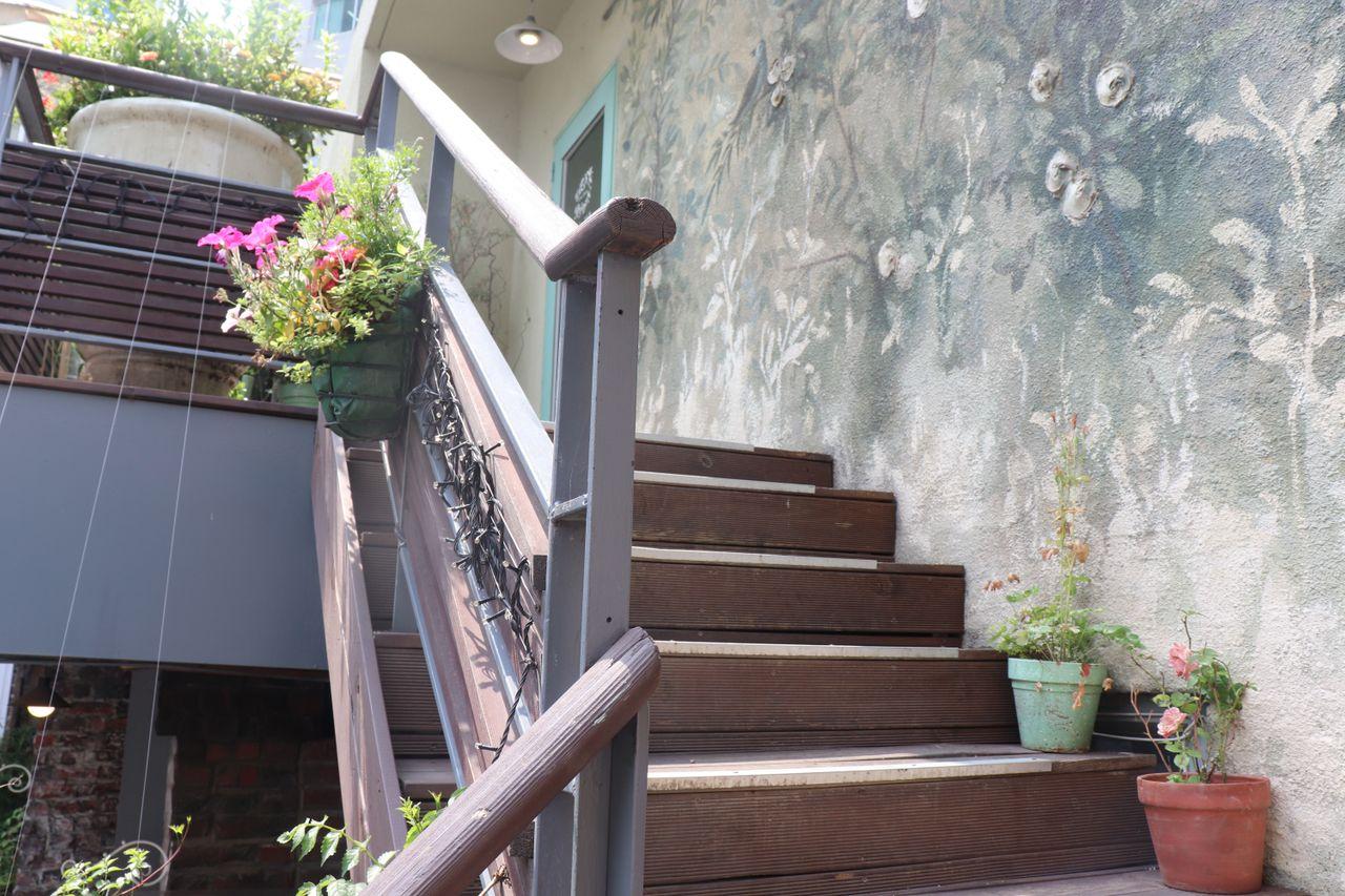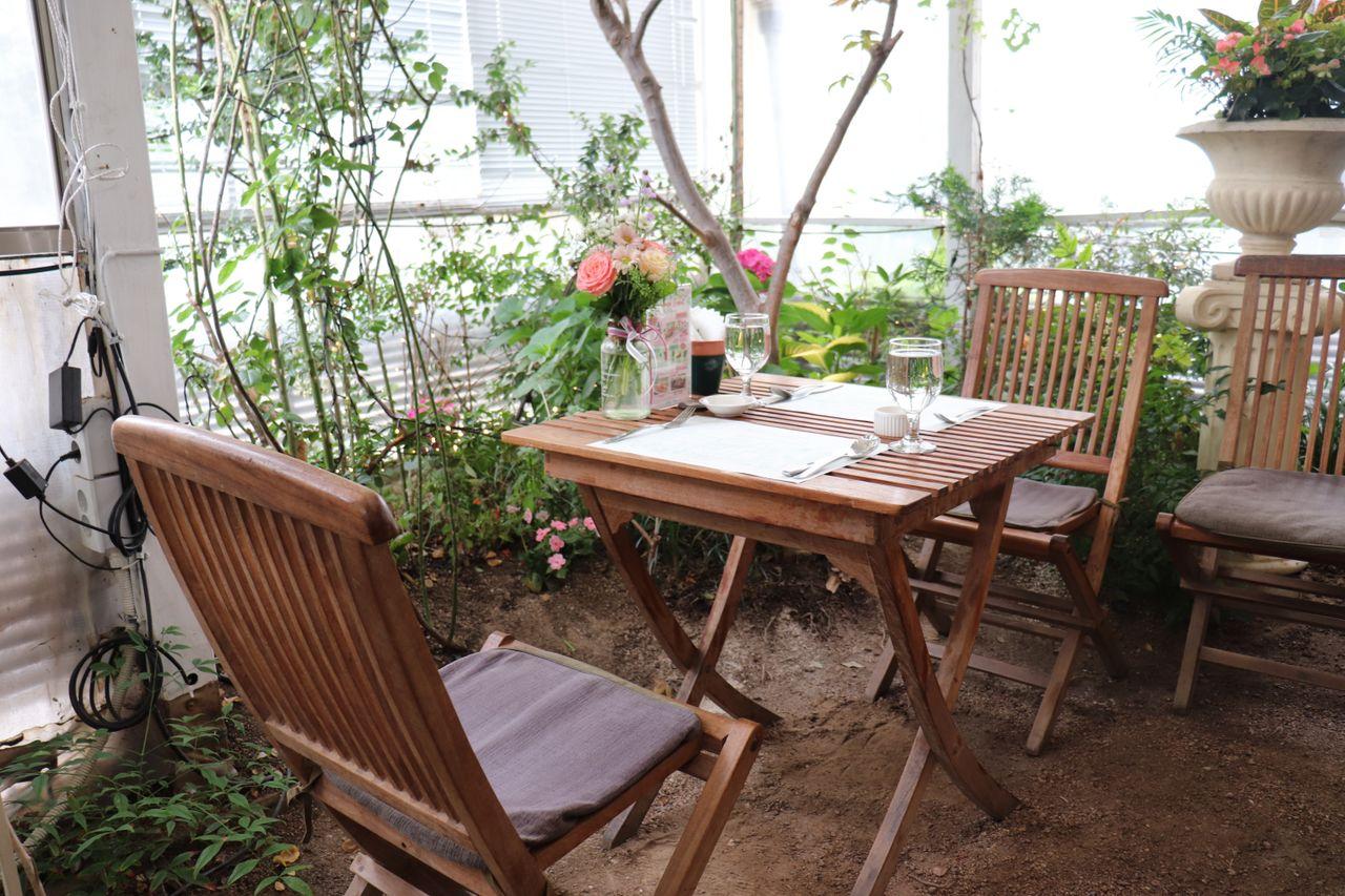 La terrasse du premier étage. Vous pouvez profiter de votre repas avec une vue sur l'extérieur parmi les verts et les fleurs.