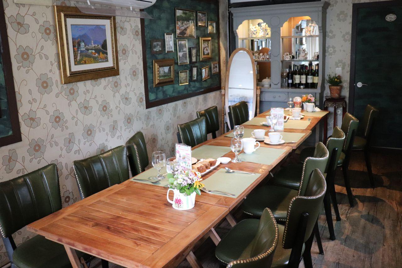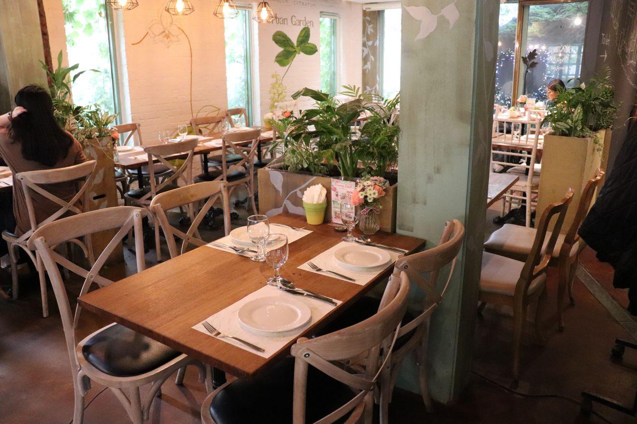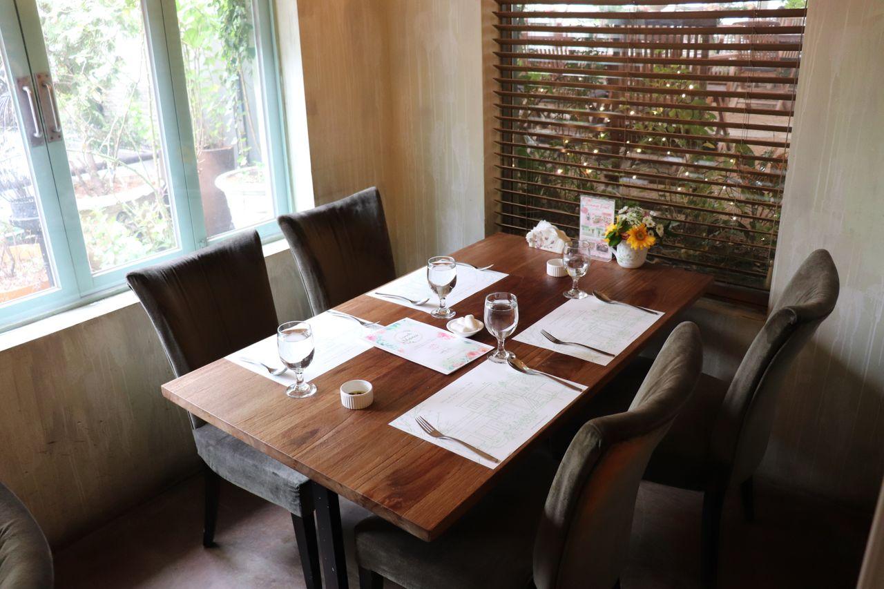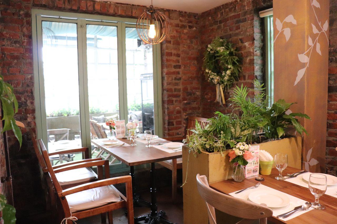 La terrasse du premier étage. Vous pouvez profiter de votre repas avec une vue sur l'extérieur parmi les verts et les fleurs.