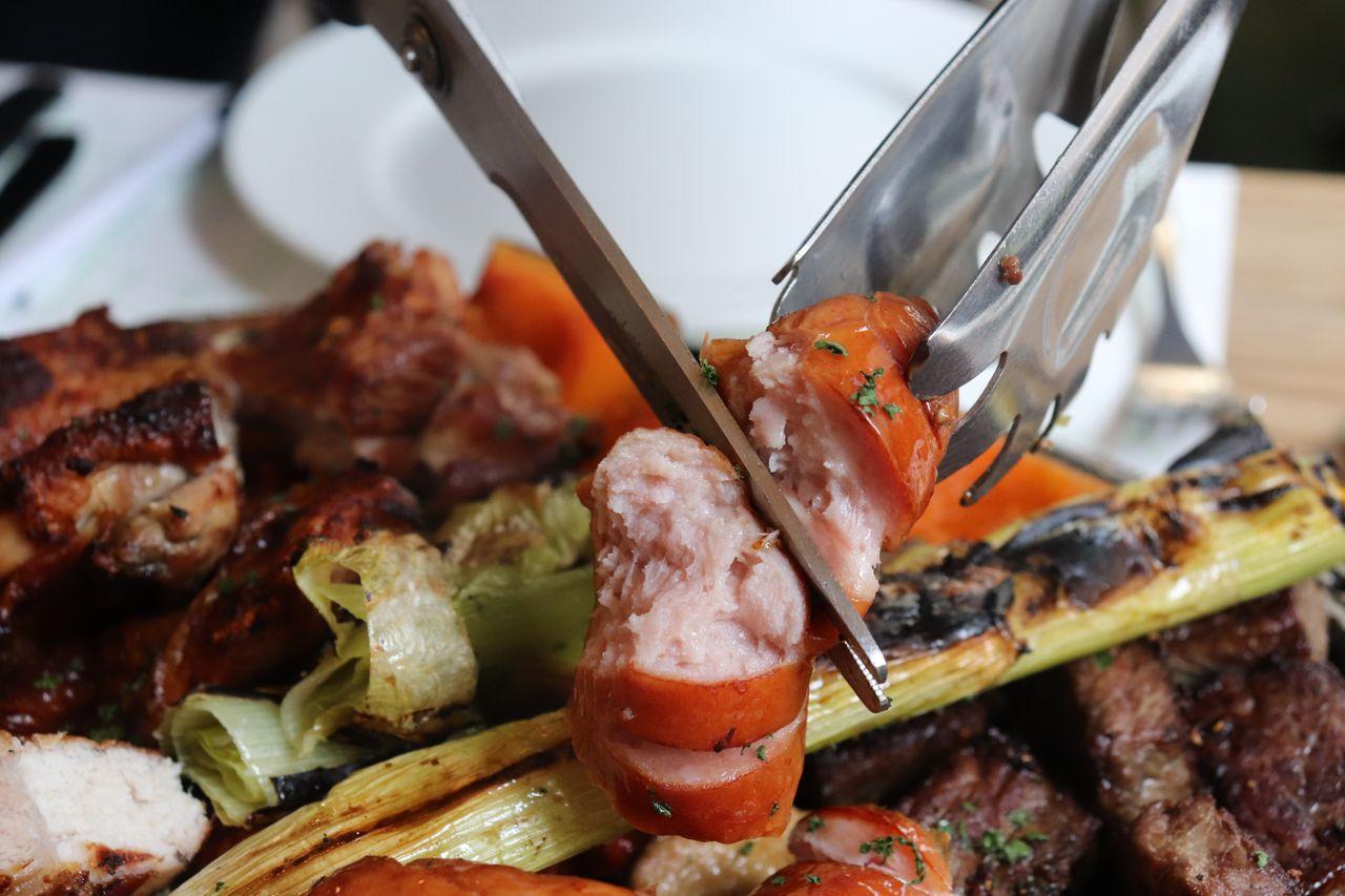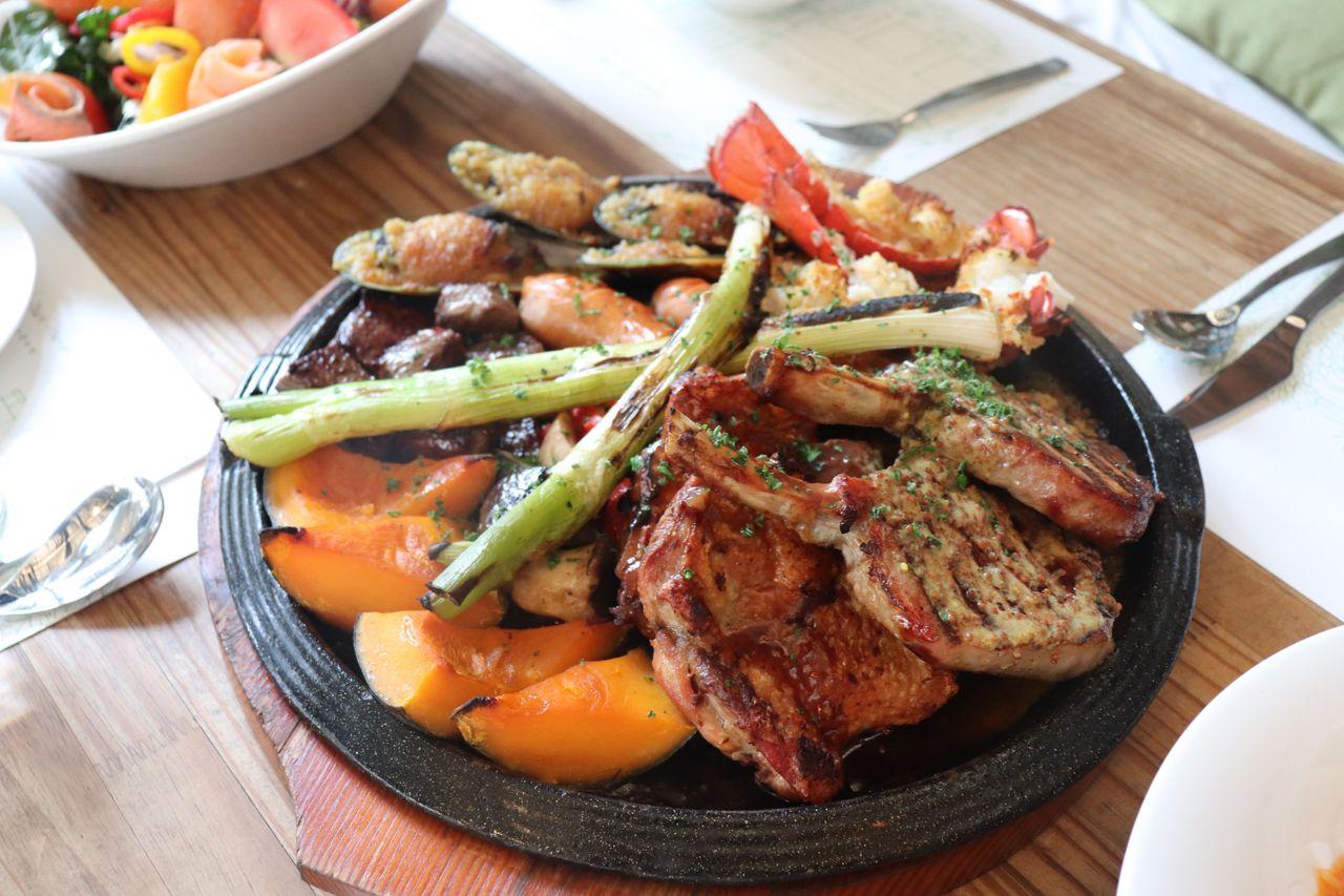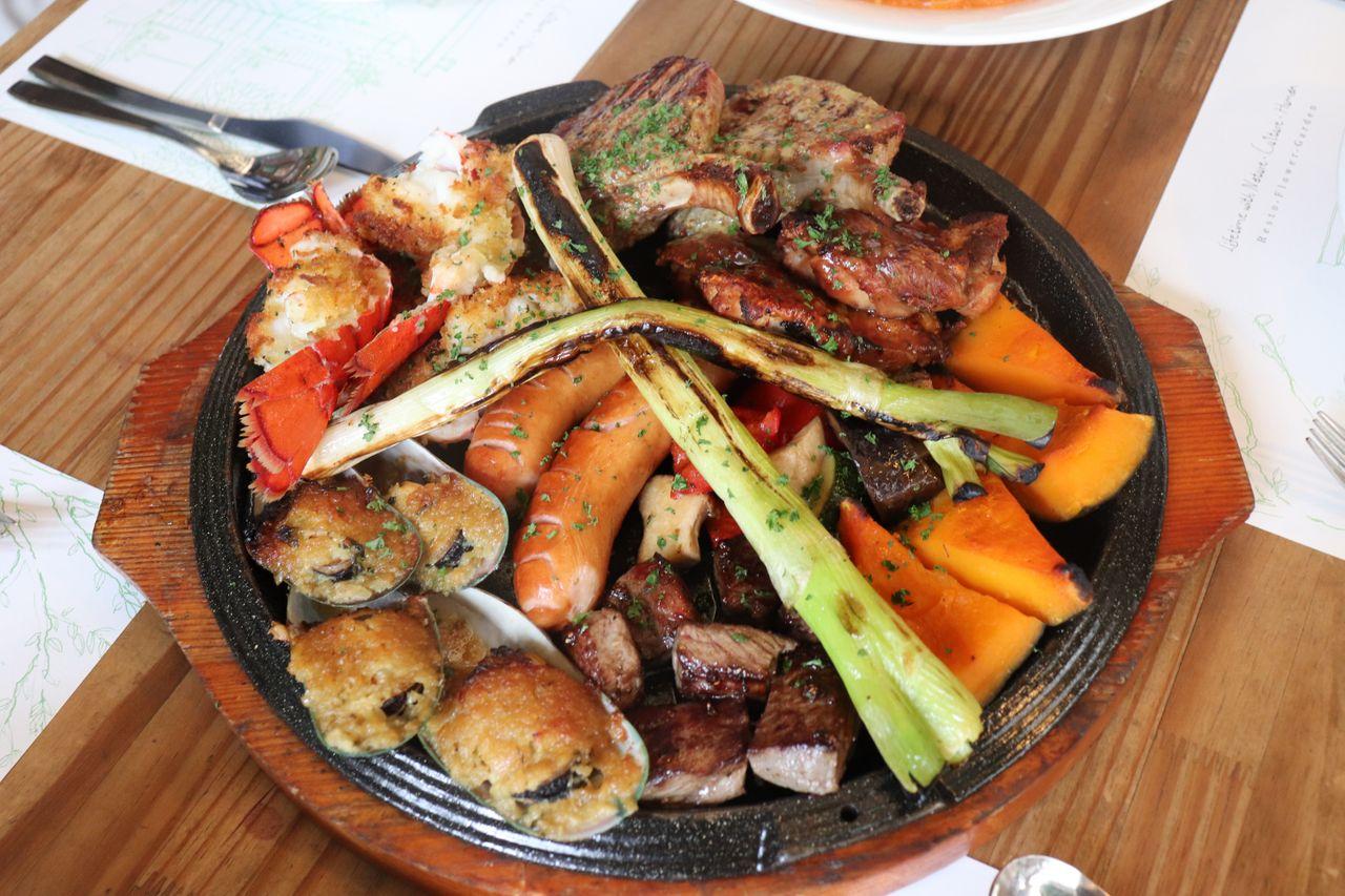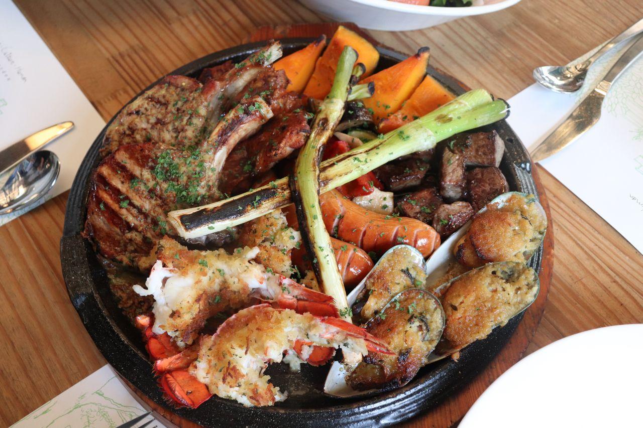 L'entrée, Premium BBQ. C'est un mélange de porc Ibérico, steak de poulet, cubes de steak, saucisses faites maison, moules enrobées de chapelure et homard.