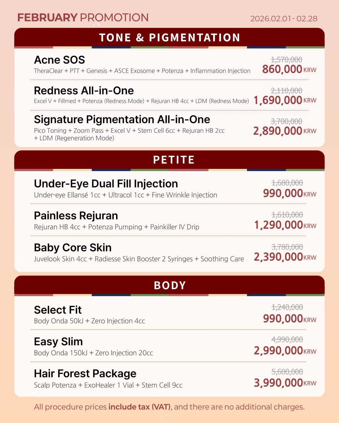 - Nous adaptons le lifting (traitement de lifting), le Skin Booster, et les traitements des pigments et cicatrices à l’état de peau de chaque personne, et nous pouvons créer un forfait d’un jour pour s’adapter à votre programme de voyage.