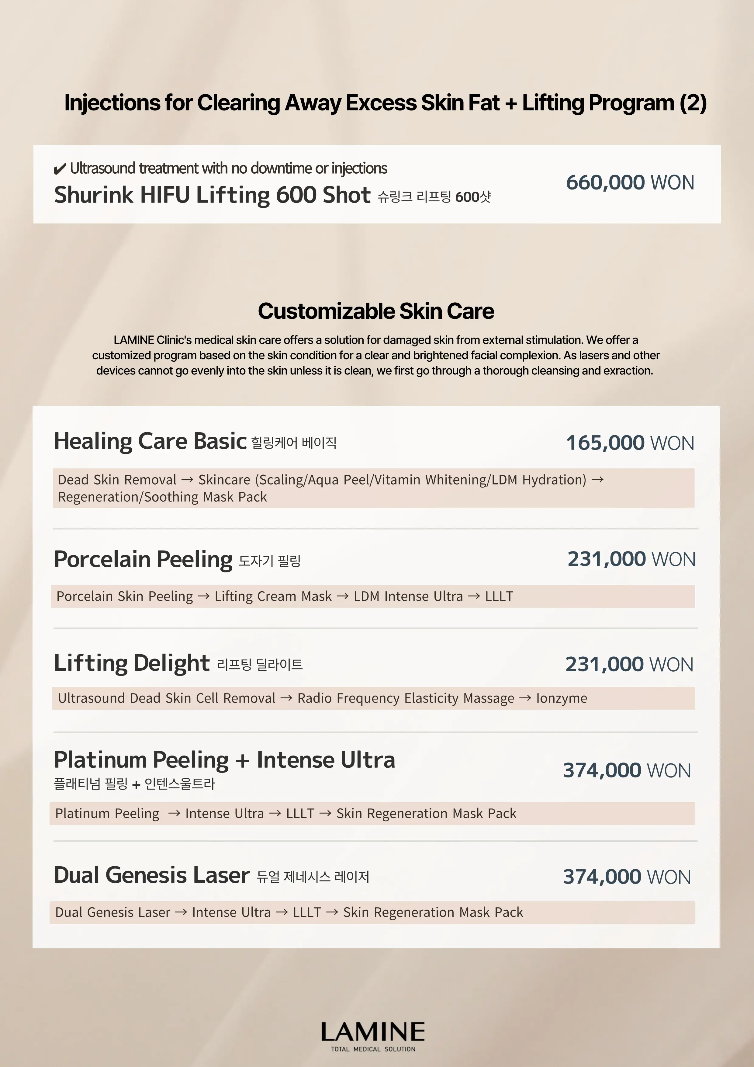 Détails | Consultation et design avec le médecin-chef → Nettoyage → Shurink HIFU lifting 100 coups → Finition |