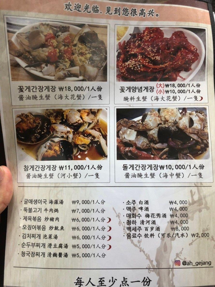 Mari kita lihat menu. Kepiting mentah yang dimarinasi dengan saus kedelai atau saus Gojuchang biasanya sangat mahal, tetapi harga di Ahyundong Ganjanggaejang sangat terjangkau.