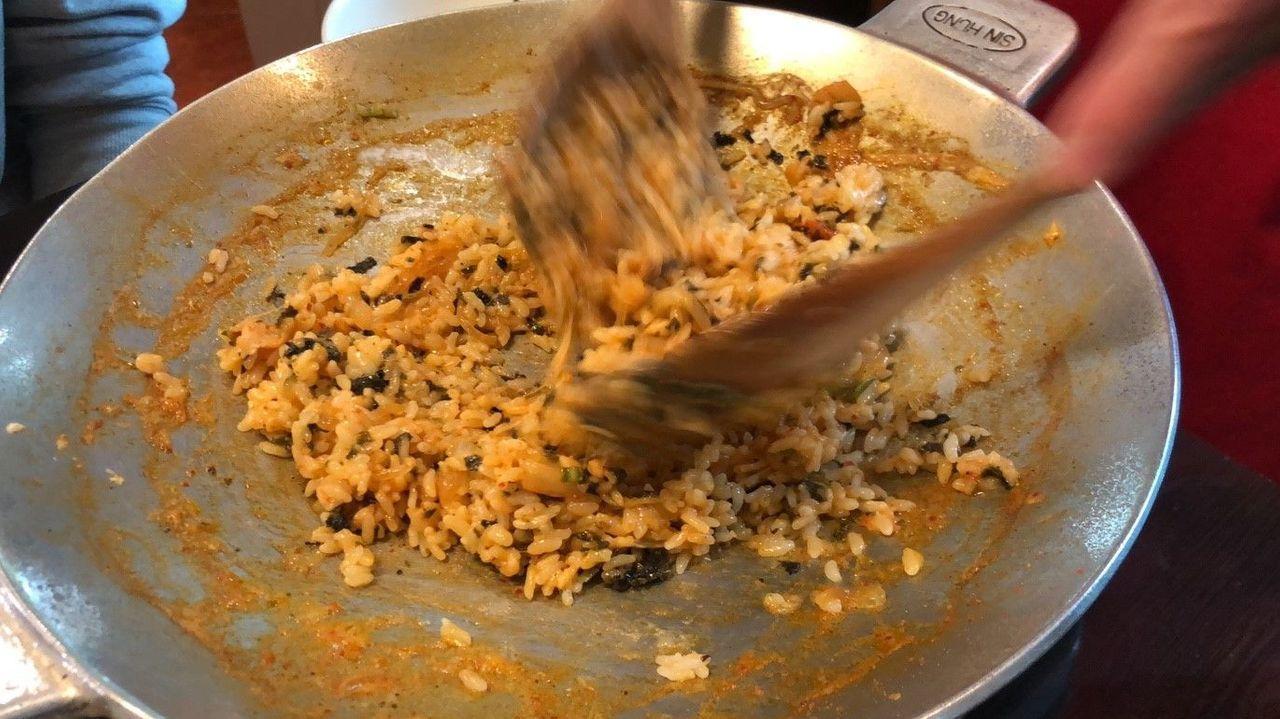 Satu hal lagi! Anda tidak boleh melewatkan nasi goreng di akhir. Pemilik toko akan membantu Anda menggoreng nasi dengan saus pedas. Anda bisa menggunakan sisa sup untuk menumis nasi.