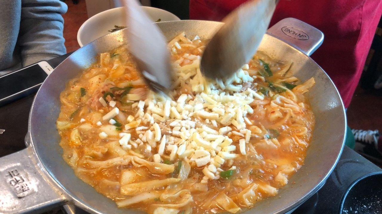 Ketika Anda memesan nasi goreng pedas, Anda harus menambahkan keju ekstra. Keju akan meleleh dalam panci. Orang yang suka keju bisa menambahkan lebih banyak keju ekstra. Begitu Anda mulai makan hidangan ini, Anda tidak akan bisa berhenti.