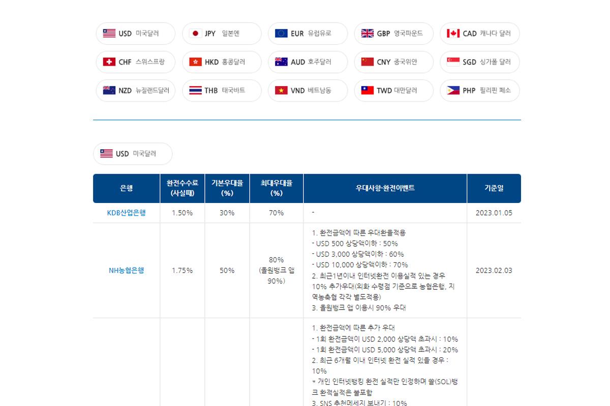 Anda dapat membandingkan diskon komisi valuta asing internet dan mata uang yang tersedia untuk setiap bank sekaligus untuk memilih bank dengan biaya valuta asing terendah. (Pergi ke 'Panduan Valuta Asing' di situs web 'Peta Jalan Valuta Asing' dan klik 'Perbandingan Diskon Komisi Valuta Asing Internet untuk Mata Uang Utama oleh Bank')