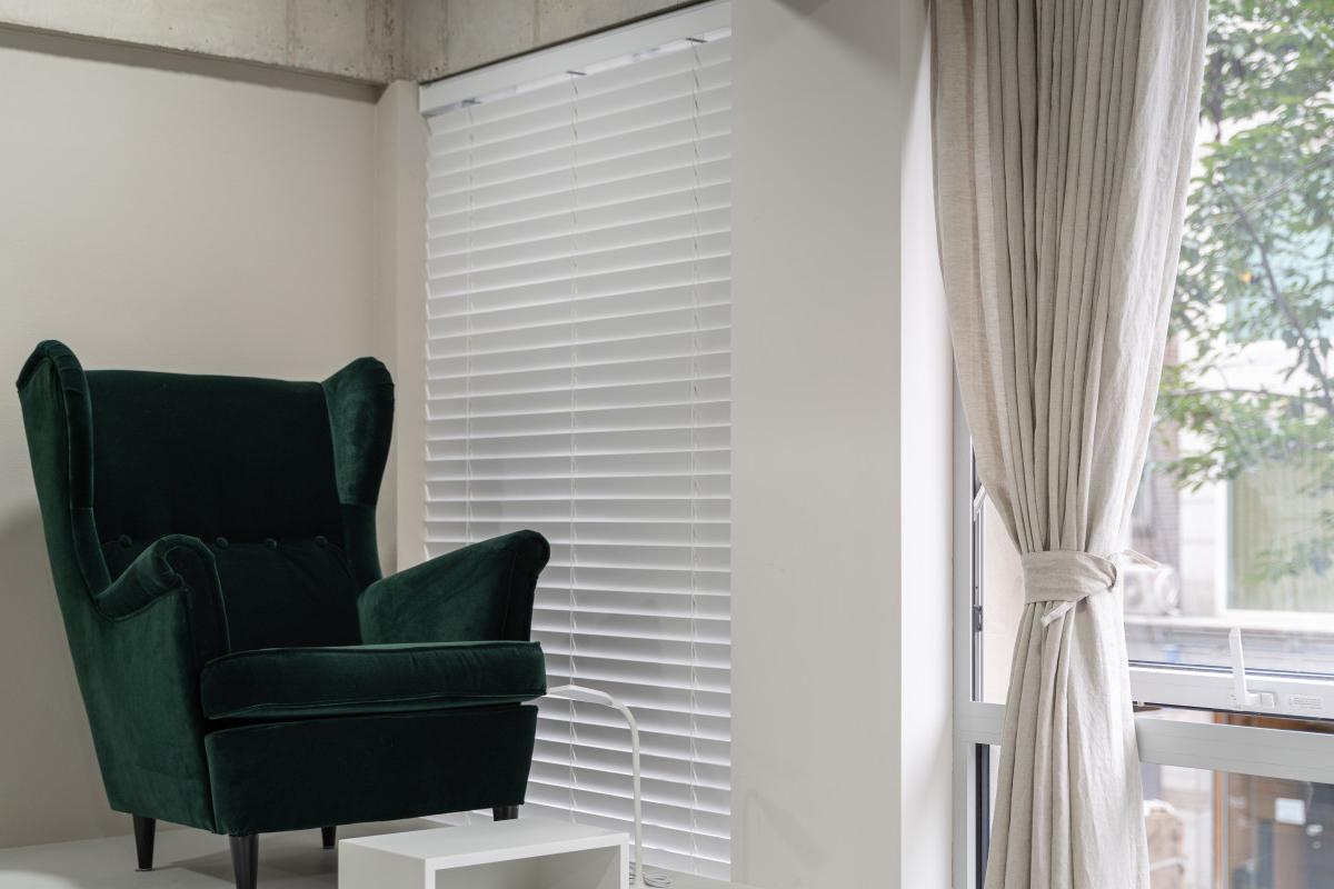 Interior toko ini bersih dan rapi. Pohon di luar dan kursi hijau di dalam, serta nada putih keseluruhan, menciptakan harmoni.