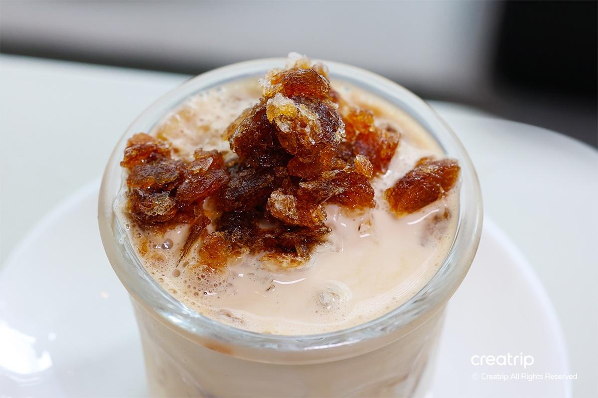 Minuman ini adalah menu manis yang dapat dinikmati dengan dalgona buatan sendiri yang renyah dan susu di toko.