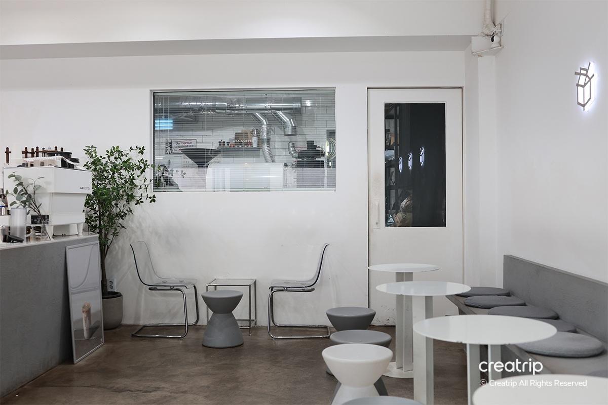 Interior toko berwarna putih terang, memberikan kesan bersih dan canggih. Selain itu, ada ruang di dalam toko di mana Anda bisa memanggang biji kopi, jadi menarik untuk melihat proses pembuatan kopi secara langsung. Di sini ada poster yang cantik dan berwarna-warni serta pernak-pernik unik yang tersebar, ini adalah zona foto yang sempurna untuk berfoto.
