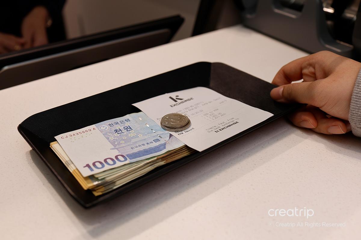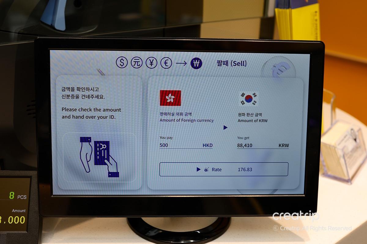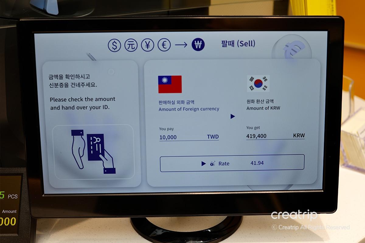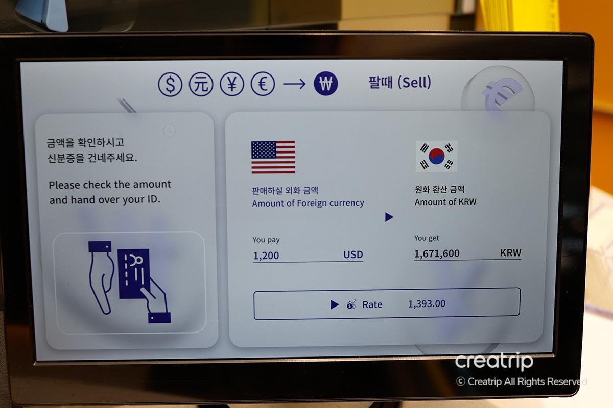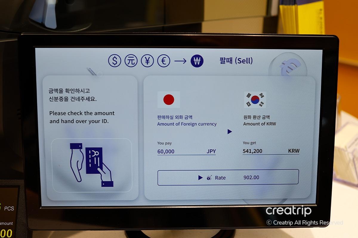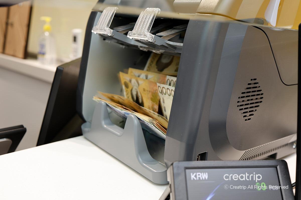 Silakan gunakan mesin di dalam konter untuk dengan cepat dan akurat menghitung jumlah uang kertas dan menyiapkan jumlah dalam Won Korea untuk ditukarkan.Silakan periksa langsung melalui angka di monitor kecil dan kwitansi untuk melihat apakah transaksi penukaran mata uang berhasil.