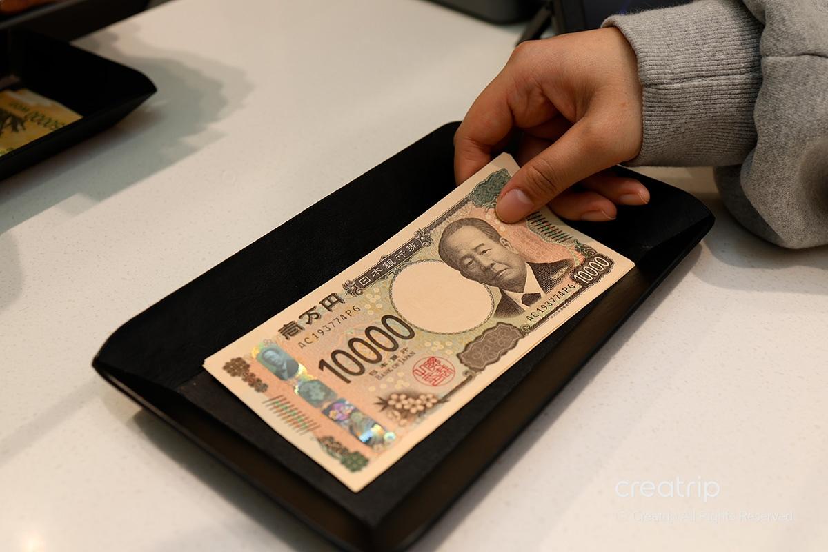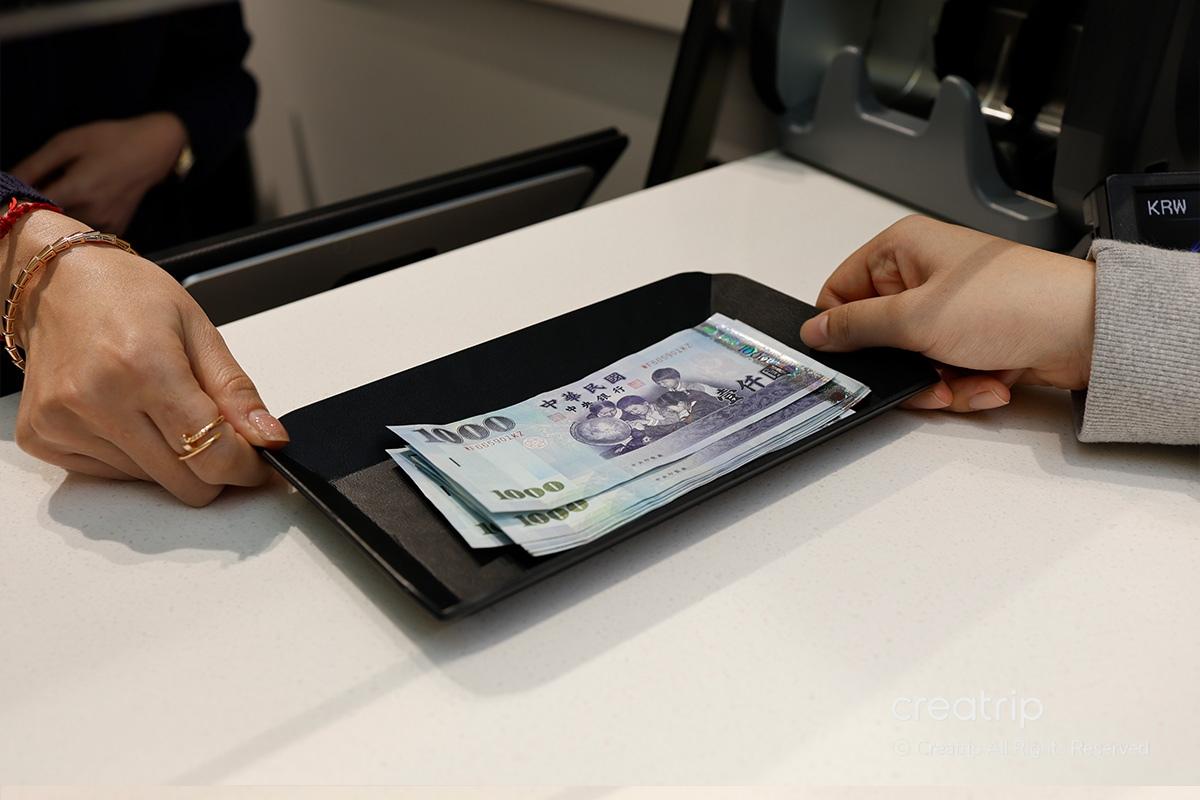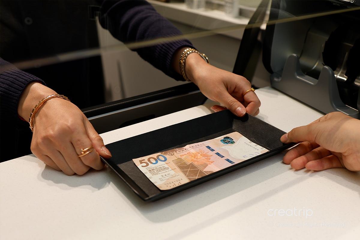 Setelah staf mengonfirmasi kupon, proses pertukaran mata uang akan secara resmi dimulai. Silakan letakkan mata uang yang telah Anda bawa di atas nampan terlebih dahulu dan serahkan.