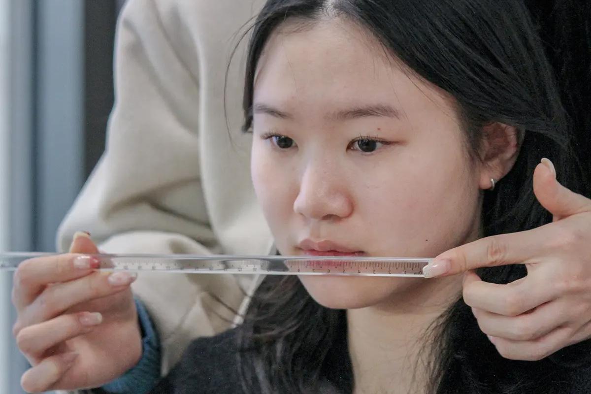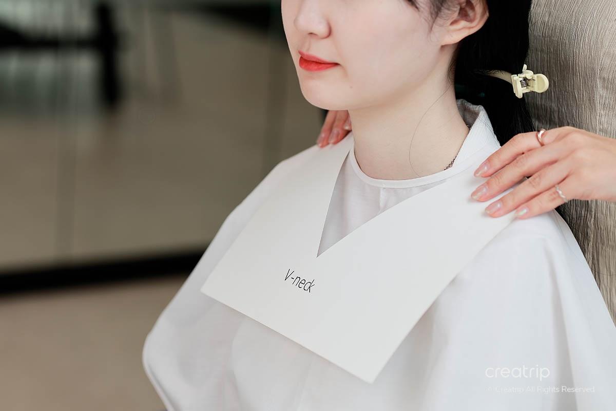 Setelah pengukuran selesai, saya duduk di depan cermin untuk mendapatkan pelatihan yang akurat. Saya mengenakan kain putih dan mengikat rambut saya untuk analisis yang lebih akurat.