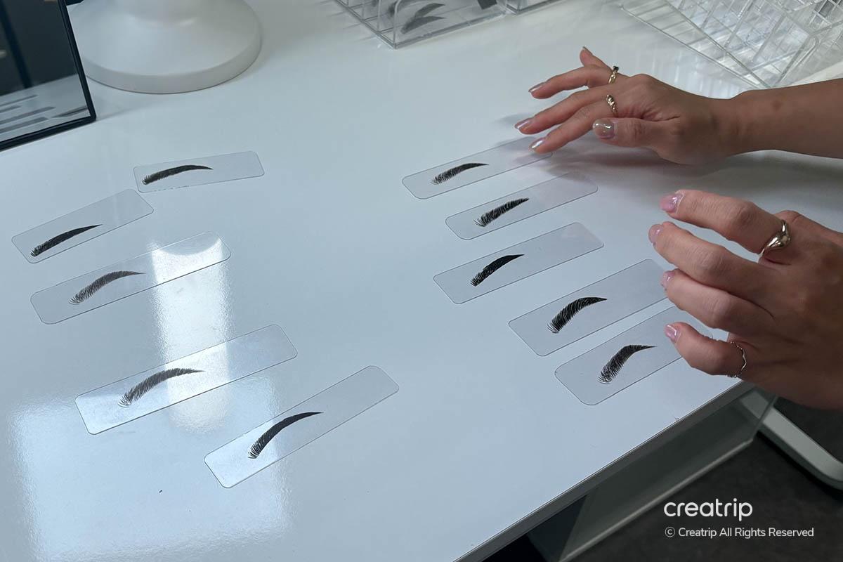 Pertama-tama, saya memeriksa bentuk alis saya. Saya mencoba menemukan bentuk alis yang cocok dengan berbagai bentuk alis dengan menempatkannya langsung di wajah saya.